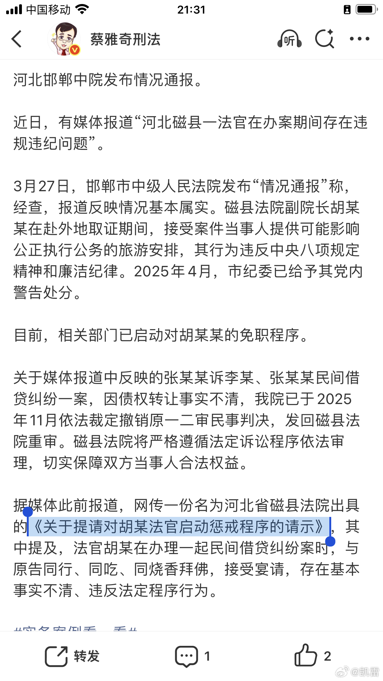《关于提请对胡某法官启动惩戒程序的请示》是真的,已启动对胡法官免职的程序。