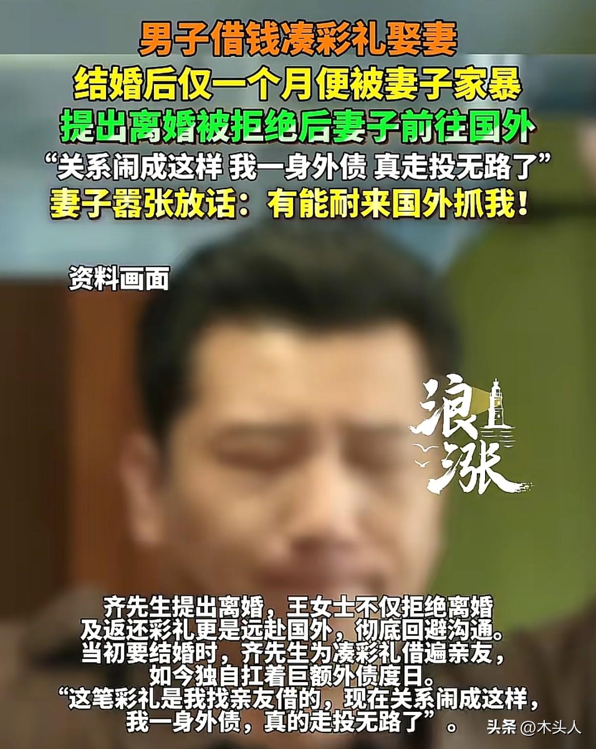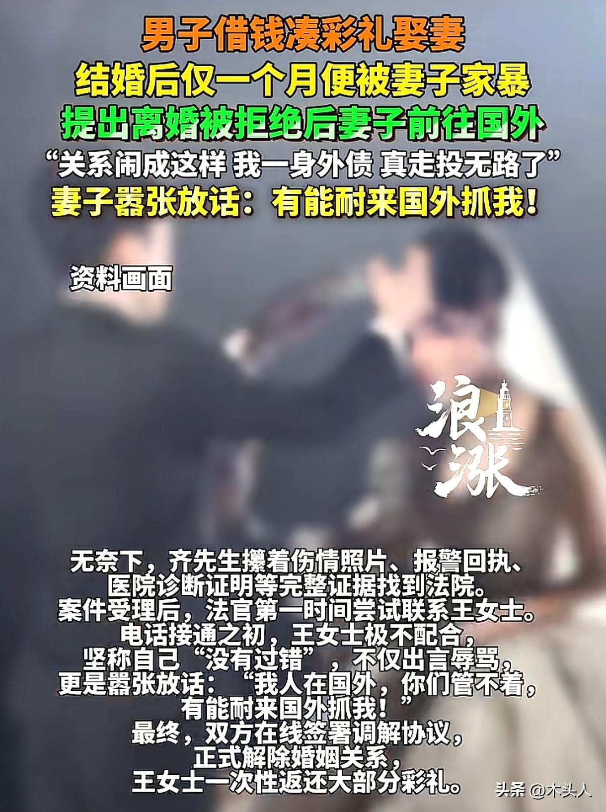 “太难了!”吉林榆树,男子和女子恋爱,女子温柔可人,交往半年,男子凑了彩礼,和女子登记结婚。可婚后两人仅在一起一个多月,妻子经常对男子动手,还持械威胁,男子180的大高个都不是妻子的对手,他长期处于恐惧中,想要离婚,可妻子不但不离婚,还带走彩礼去了国外。男子实在熬不住了,起诉离婚,法院联系女子,没想到女子不仅出言辱骂,更是嚣张放话:“我人在国外,你们管不着,有能耐来国外抓我!”结局让所有人都松了一口气。 齐先生和王女士初相识时,王女士温柔体贴,善解人意,齐先生以为自己遇到了真爱。 为了和对方结婚,他凑了彩礼,两人相识不到半年,就登记结婚了。 可婚后的日子,却让齐先生苦不堪言,他身高一米八,在旁人眼里也算是个壮实的小伙,可在妻子面前,他却毫无还手之力。 每次被妻子打骂,他心里既委屈,又害怕,但却只能默默忍受。 两人结婚才一个多月,齐先生就觉得这日子实在不过下去了,他鼓起勇气提出离婚,可王女士却说什么都不肯同意,还理直气壮地拒绝返还彩礼。 更过分的是,她竟然直接远赴国外,切断了和齐先生的一切沟通渠道。 齐先生这下可傻眼了,当初为了结婚给彩礼,他借遍了亲朋好友,欠了一屁股债。 现在倒好,妻子拍拍屁股,带走彩礼走了,自己还得独自扛着这巨额外债,每天一睁眼就是催债的电话,他感觉自己的生活陷入了无尽的黑暗,真的走投无路了。 无奈之下,他整理了伤情照片、报警回执、医院的诊断证明等,起诉离婚。 法院联系王女士,可她不仅不承认自己有错,还嚣张放话:“你们有能耐来国外抓我!” 看着妻子强硬的态度,齐先生很是着急,法院没放弃,耐心跟王女士释法。 最终,王女士松了口,两人在线签署协议,协议离婚,王女士返还了大部分彩礼。 拿到协议的那一刻,齐先生压在心头的大石头终于落了地。 为什么齐先生可以离婚成功,并拿回彩礼呢? 《民法典》第1079条规定:夫妻一方要求离婚的,可以由有关组织进行调解或者直接向人民法院提起离婚诉讼。 法院判决离婚的标准是“夫妻感情是否确已破裂”,而家暴属于法定感情破裂情形之一。 王女士和齐先生结婚才一个月,就经常因生活琐事,对齐先生施暴,还持械威胁,家庭暴力属于违法行为,经法院调解无效的,法院一般会准予双方离婚。 齐先生和王女士虽然办理了结婚登记,可两人共同生活时间短,并且齐先生给付的彩礼,大部分是找人借的,给付彩礼后,导致其生活困难,因此,他有权要求王女士返还彩礼。 男女恋爱,给付彩礼,一定要量力而行,不要打肿脸充胖子,受到家庭暴力,可以果断离婚止损。
