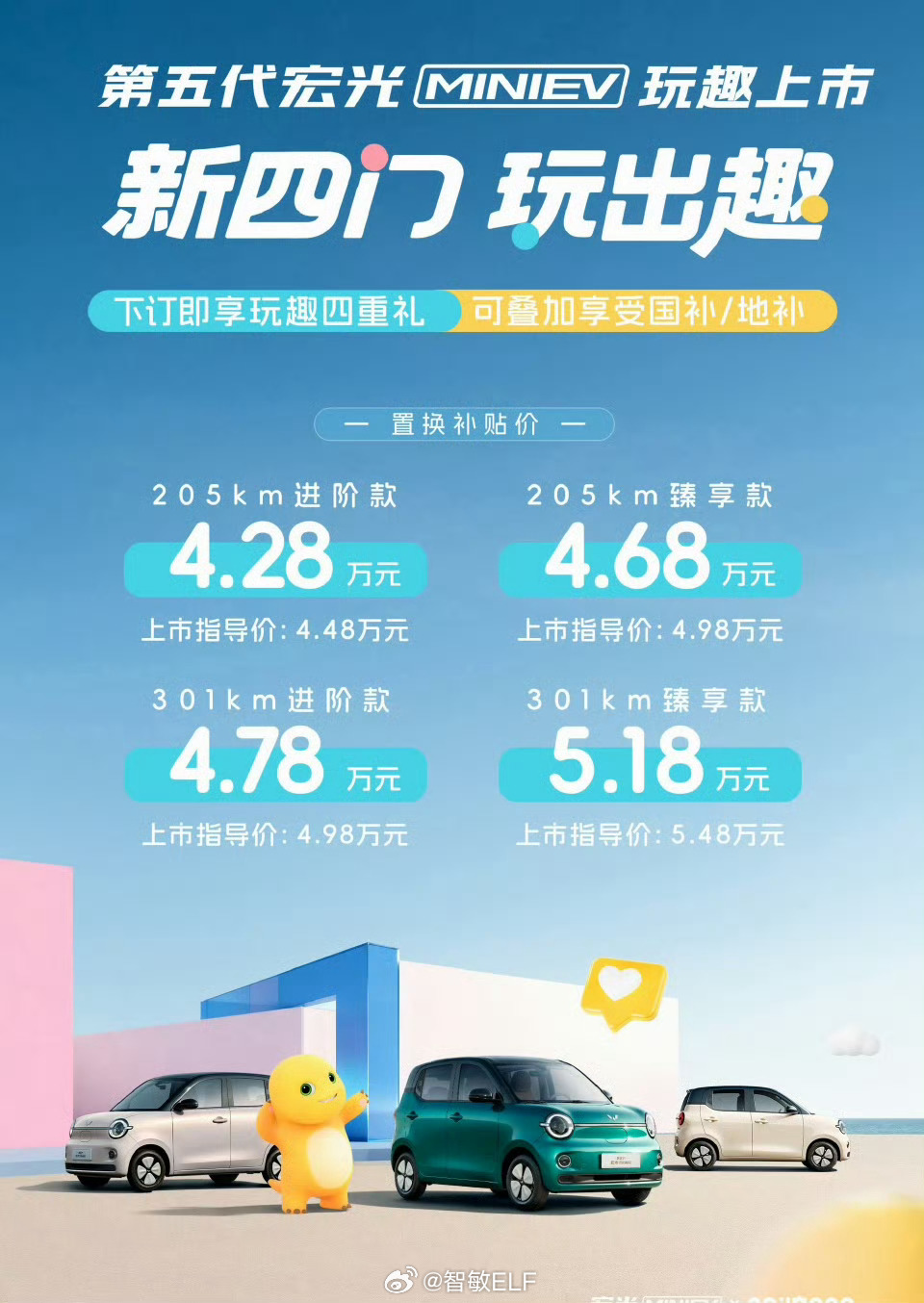 今天第五代宏光MINIEV上市了,四门四座、10.1英寸大屏、301km续航、直流快充、更安全的车身。它又变得更强了,但不变的是依旧保持着它亲民和实用的初心。