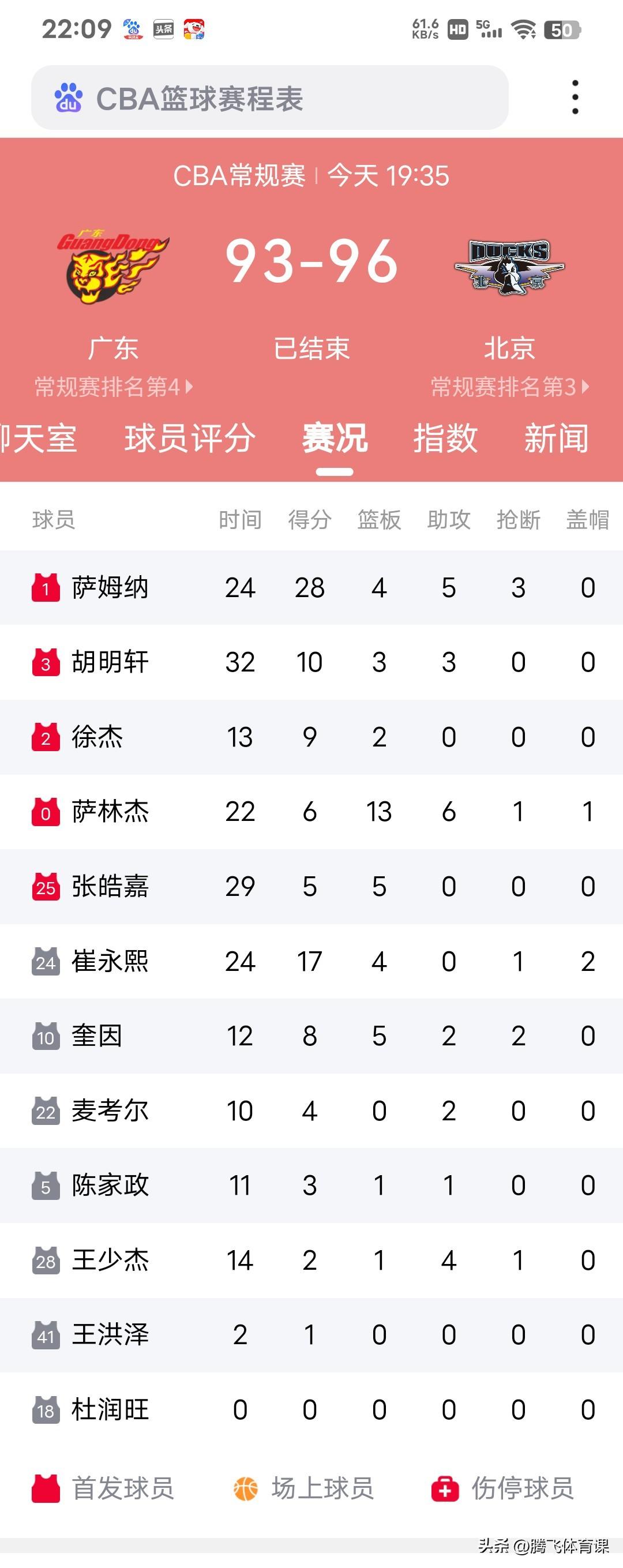 广东主场93:96被北京绝杀,杜锋三大调整值得肯定: 1.徐杰,萨林杰重回首发阵容。 2.为崔永熙设定战术体系。 3.弃用杜润旺,减少麦考尔出场时间。 广东打出一波漂亮的开局(18:1),比分曾一度领先北京队20分(45:25)主要原因还是杜锋调整了首发阵容,徐杰搭档萨林杰成为广东队一,五挡拆最大威胁,徐杰与胡明轩组成后场,徐杰负责组织分配球权,胡明轩重回熟悉的2号位,搭配进攻火力更强的萨姆纳,用防守,冲抢篮板更加出色的张皓嘉取代杜润旺,这套阵容功放兼备,广东队终于摆脱上半场再次挖坑的现象,也验证了这套阵容是广东队最合理的阵容,若不是徐杰过早犯规,北京队恐怕难以全身而退。 而崔永熙已逐渐适应比赛的节奏以及对抗强度,比赛中拥有更多的出手权,这是主教练杜锋专门给崔永熙设定的战术体系,崔永熙本场比赛贡献17分4篮板1次抢断2次盖帽,曾经的中国男篮第一小前锋终于又回来了,相信接下来的比赛,崔永熙会得到更多的战术地位。 而杜润旺的状态长期低迷也彻底被杜锋放弃,连续两场比赛张皓嘉均得到杜锋的重用,而小将陈家政场上效率非常不错,在焦泊乔还不知道何时归队的情况下,陈家政应该得到更多的出场机会。