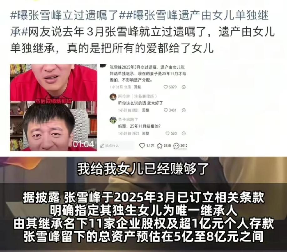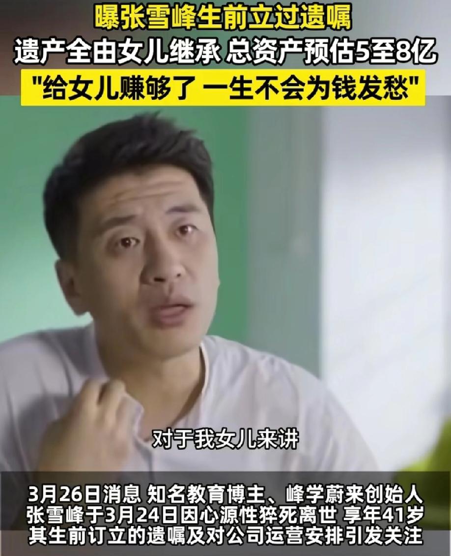 张雪峰突然离世,他最放不下的估计是自己年仅11岁的女儿吧? 有句古语说的好:“父母爱子必为其计生远”,这句话在张雪峰这里体现的淋漓尽致。 他曾在一次直播时就曾提到,他不希望自己的女儿将来为了生计所累,他给女儿已经赚够了。这不是一句简单的承诺,这是一个父亲给女儿全部的爱,他也确实做到了。 但是个人我觉得,孩子成长的路上,有时候亲情的陪伴比钱更重要,她把爸爸的离去说成是“天上的文曲星换届”,可见在孩子心里是不愿意相信爸爸已离她而去。