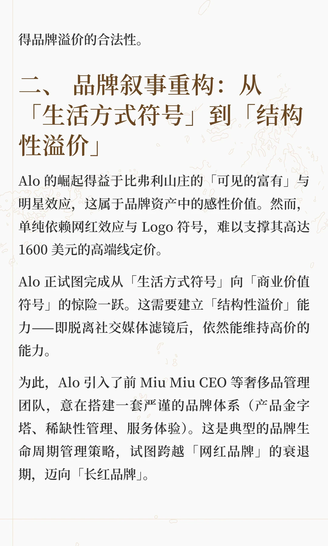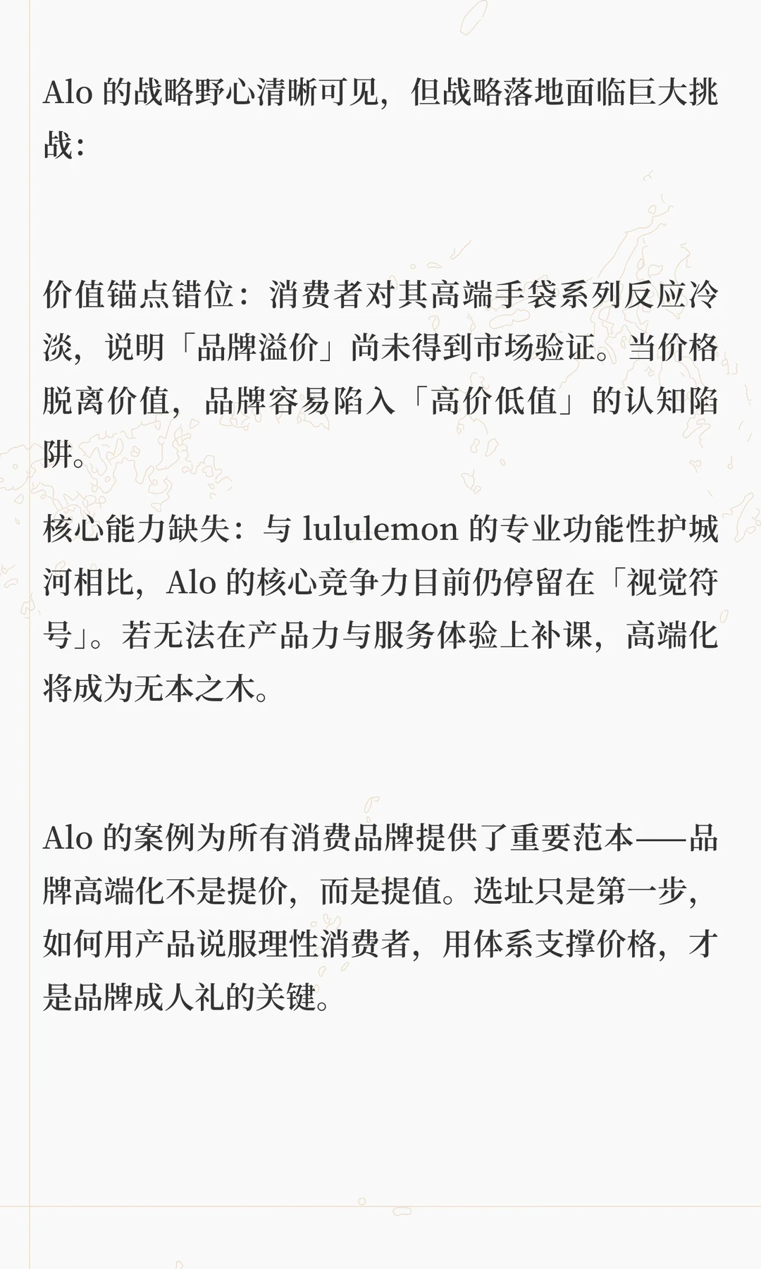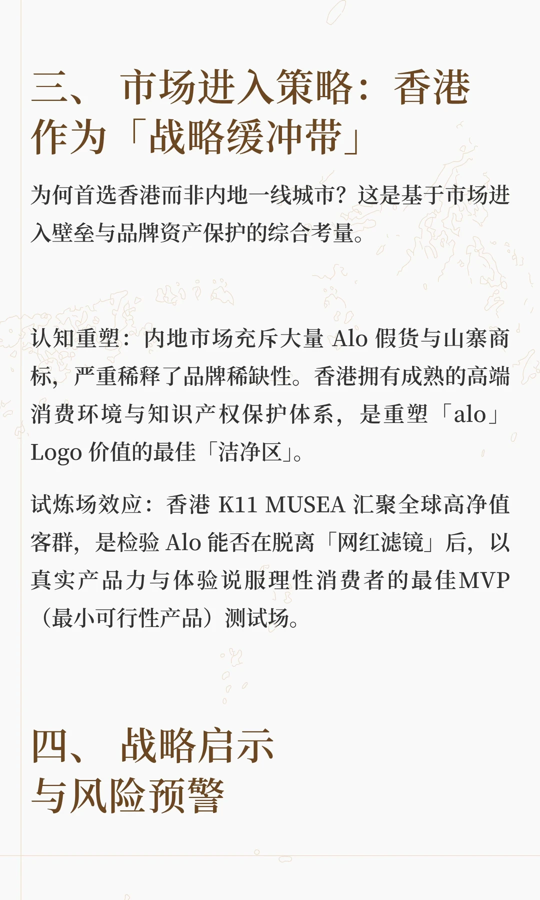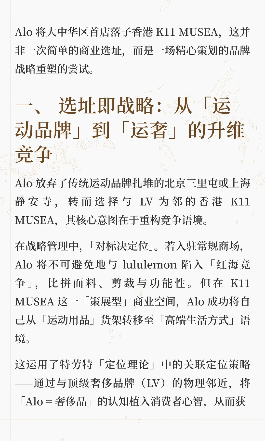 Alo 首店落户香港 K11 MUSEA,通过与LV邻近,重构竞争语境,将品牌升维至「运奢」。引入奢侈品管理团队,建立「结构性溢价」,并选择香港作为市场缓冲带,以保护品牌资产。