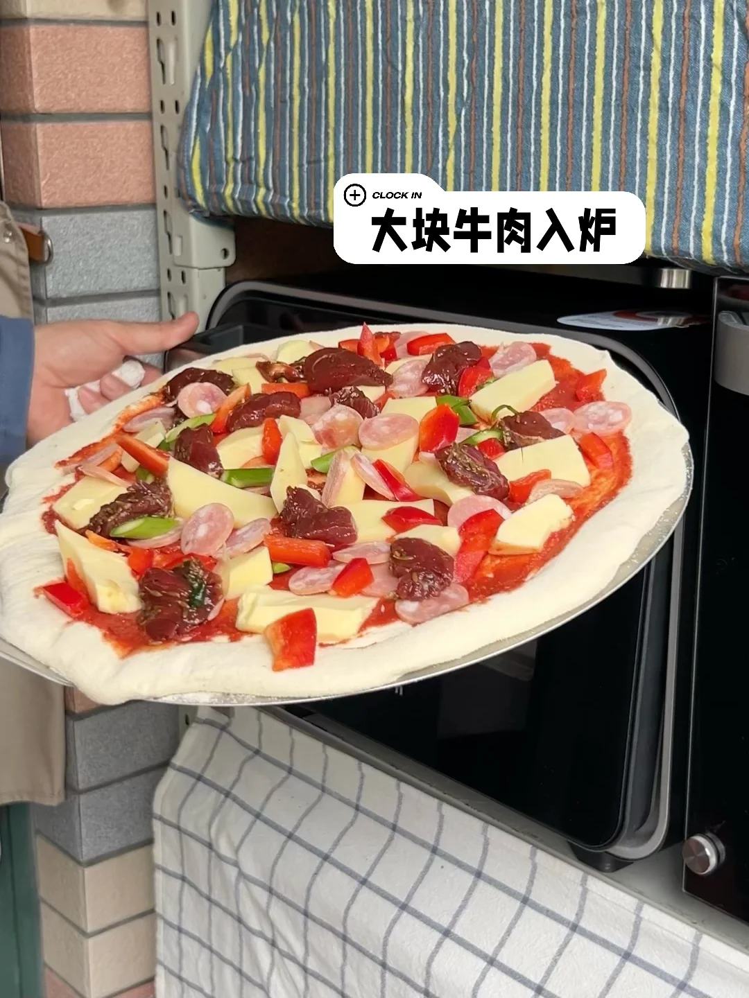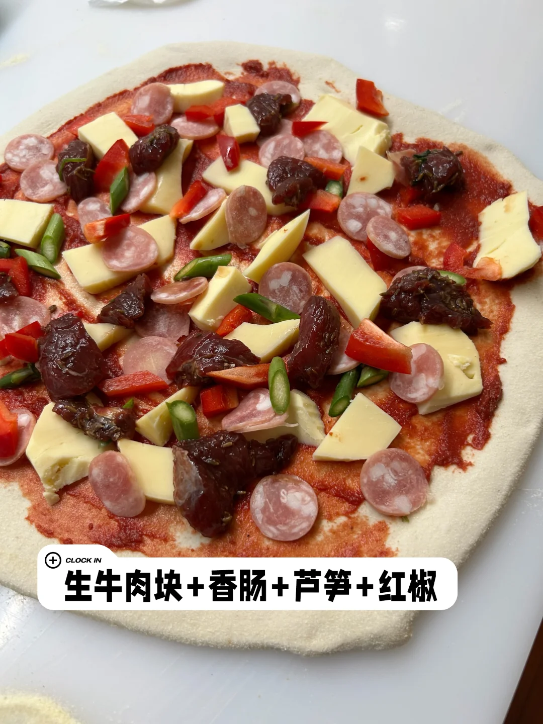 3、撒料:马苏里拉块、提前码味的牛肉大粒、香肠片、芦笋、红椒