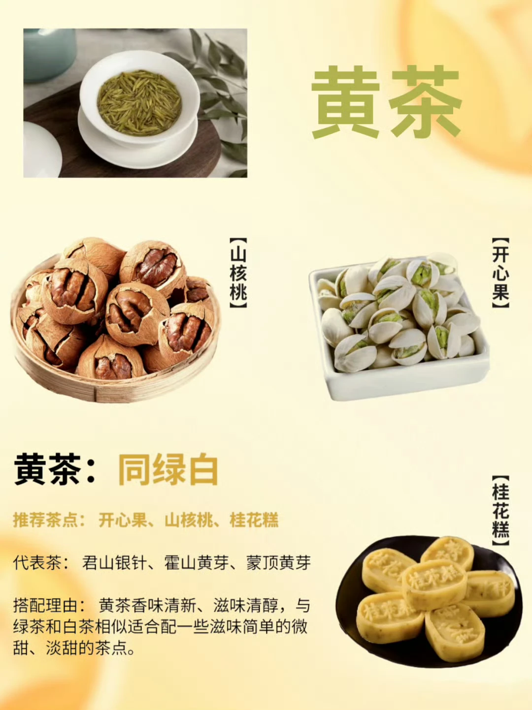 黄茶口感介于绿茶和白茶之间,鲜爽柔和,茶点搭配直接参照绿茶和白茶就可以。