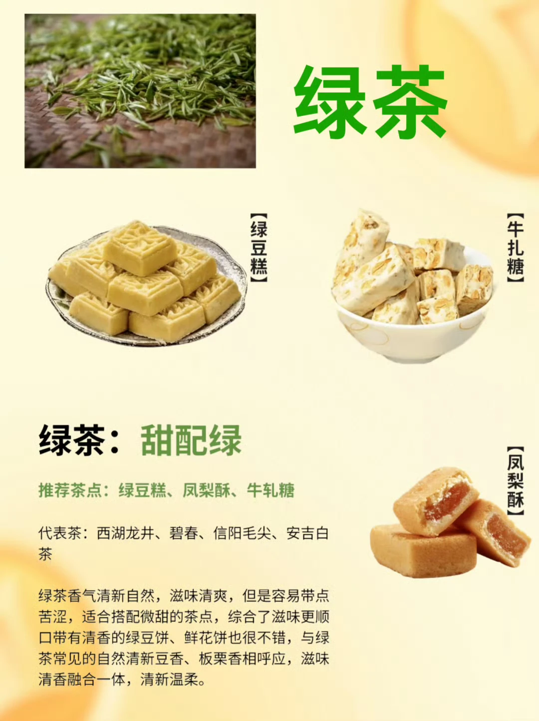 首选:绿豆糕、桂花糕、抹茶曲奇、水晶糕,清甜不腻,和绿茶的鲜爽完美融合,一口茶一口糕,春日感拉满!