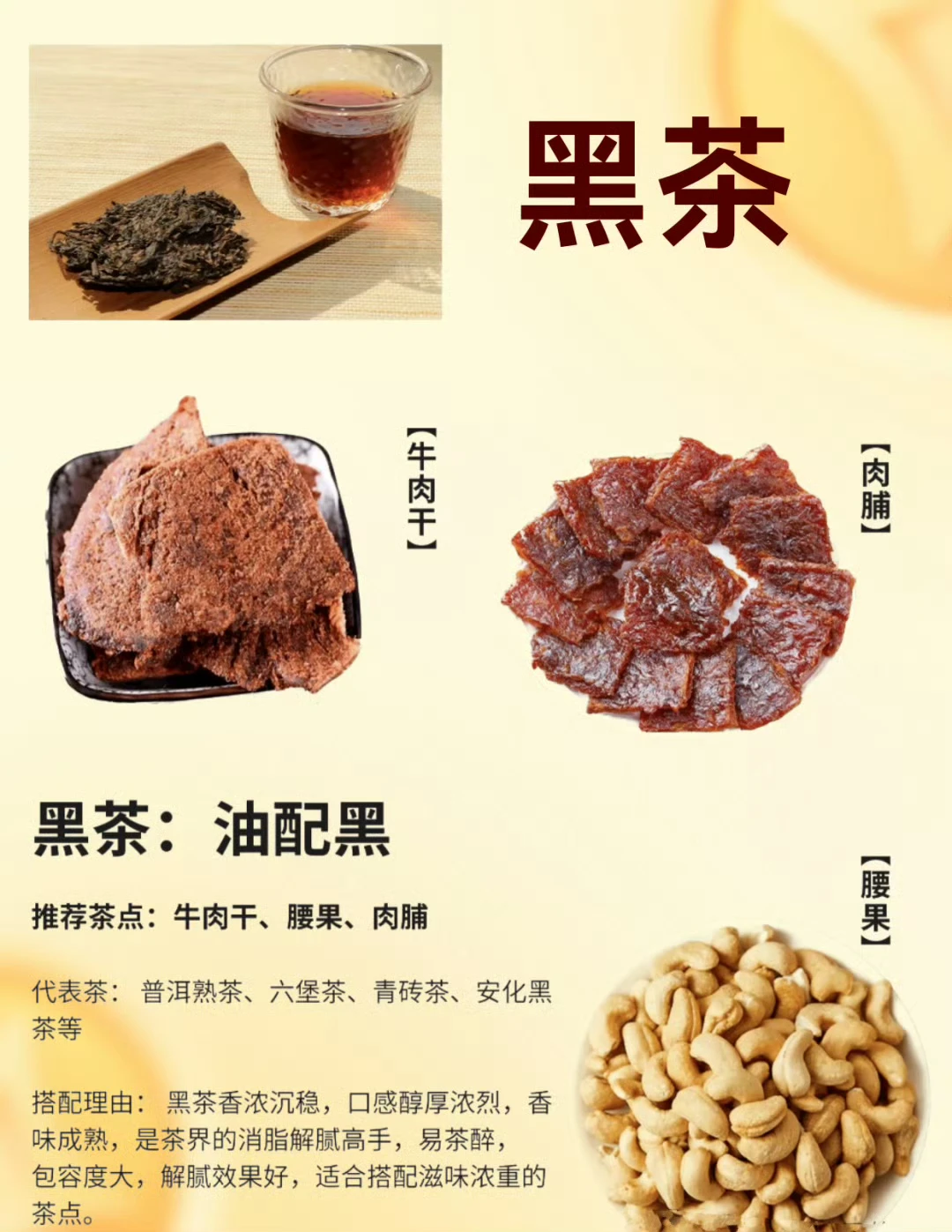 黑茶醇厚绵密,普洱、六堡茶这类还带陈香,解油去腻,搭配偏油润的茶点刚好互补。