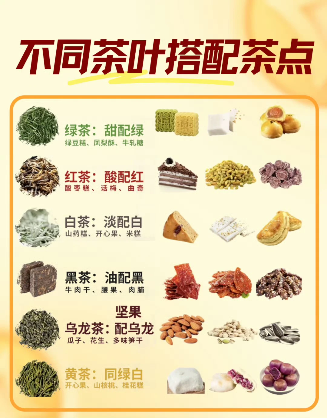 整理了超实用的六大茶类茶点搭配口诀,简单好记,新手也能轻松拿捏,喝茶氛围感拉满~