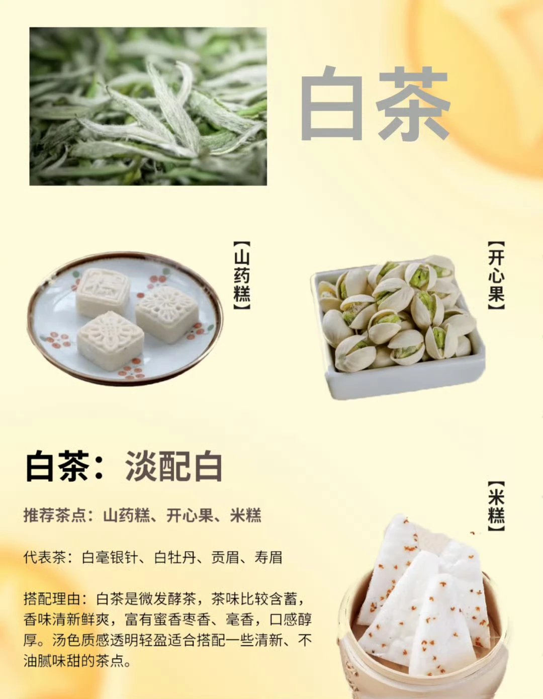 白茶清淡素雅,茶汤鲜爽甘醇,口味淡雅,茶点要选清淡口的,不能抢茶的风头。