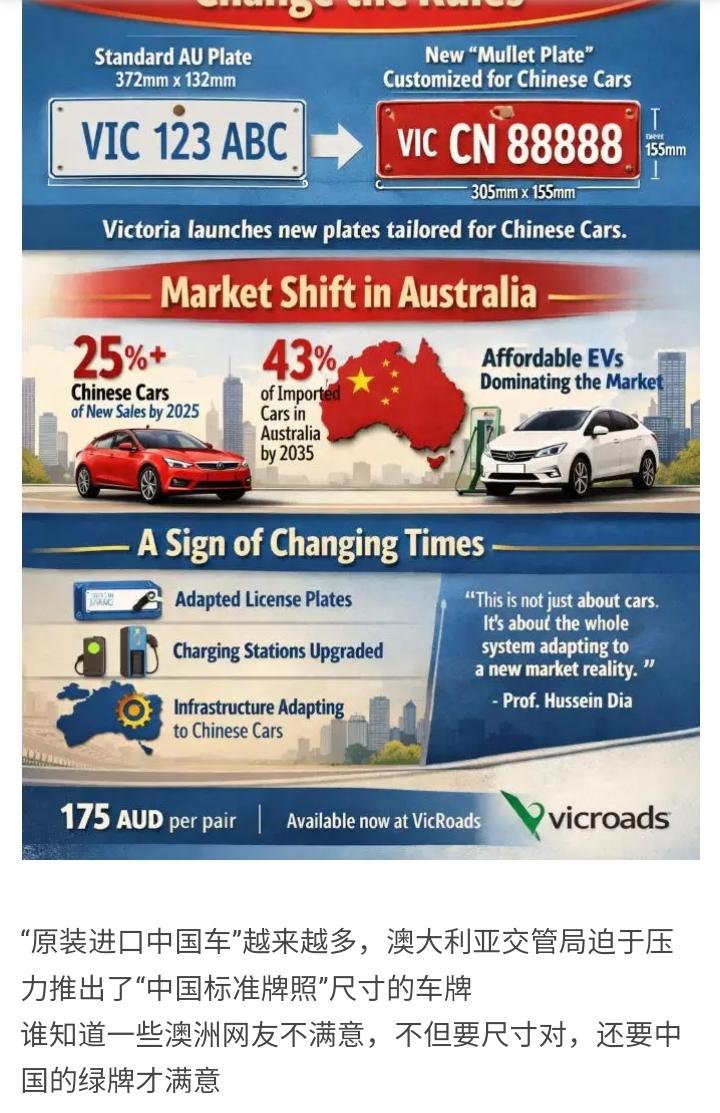 在国内不受待见的新能源车“小绿牌”被澳大利亚车主盯上了。 随着越来越多的中国原装车出口到澳大利亚,澳大利亚交管局于最近推出了适应中国进口车,车牌安装孔位和尺寸的新版汽车号牌。 消息一出,有一些澳大利亚车主表示,不但尺寸要对,还要中国同款小绿牌。 2025年就有25万辆中国车出口到澳大利亚,占澳大利亚新车销售近五分之一。 多说一句,新能源车那小绿牌第一眼看去,是真丑。
