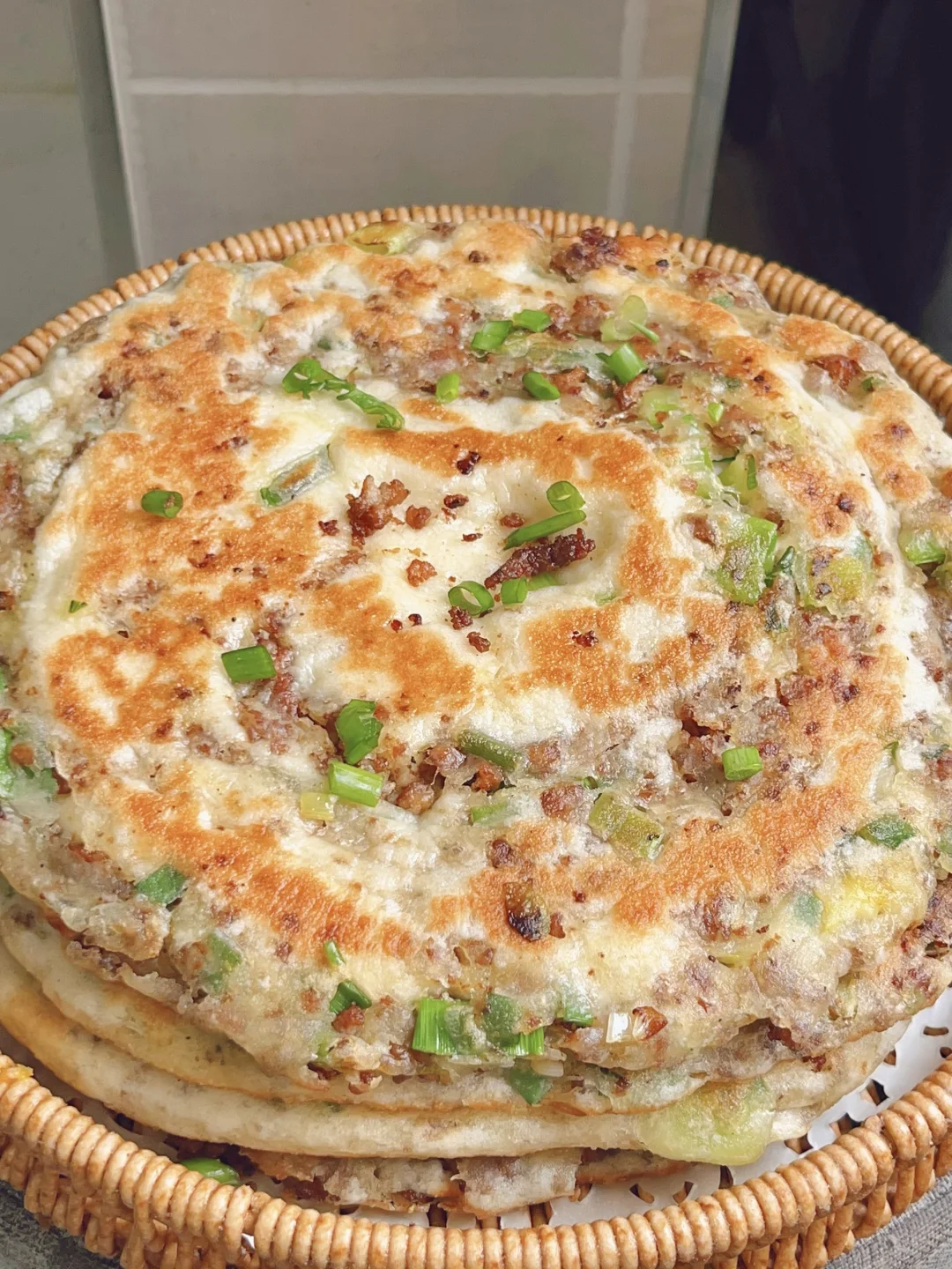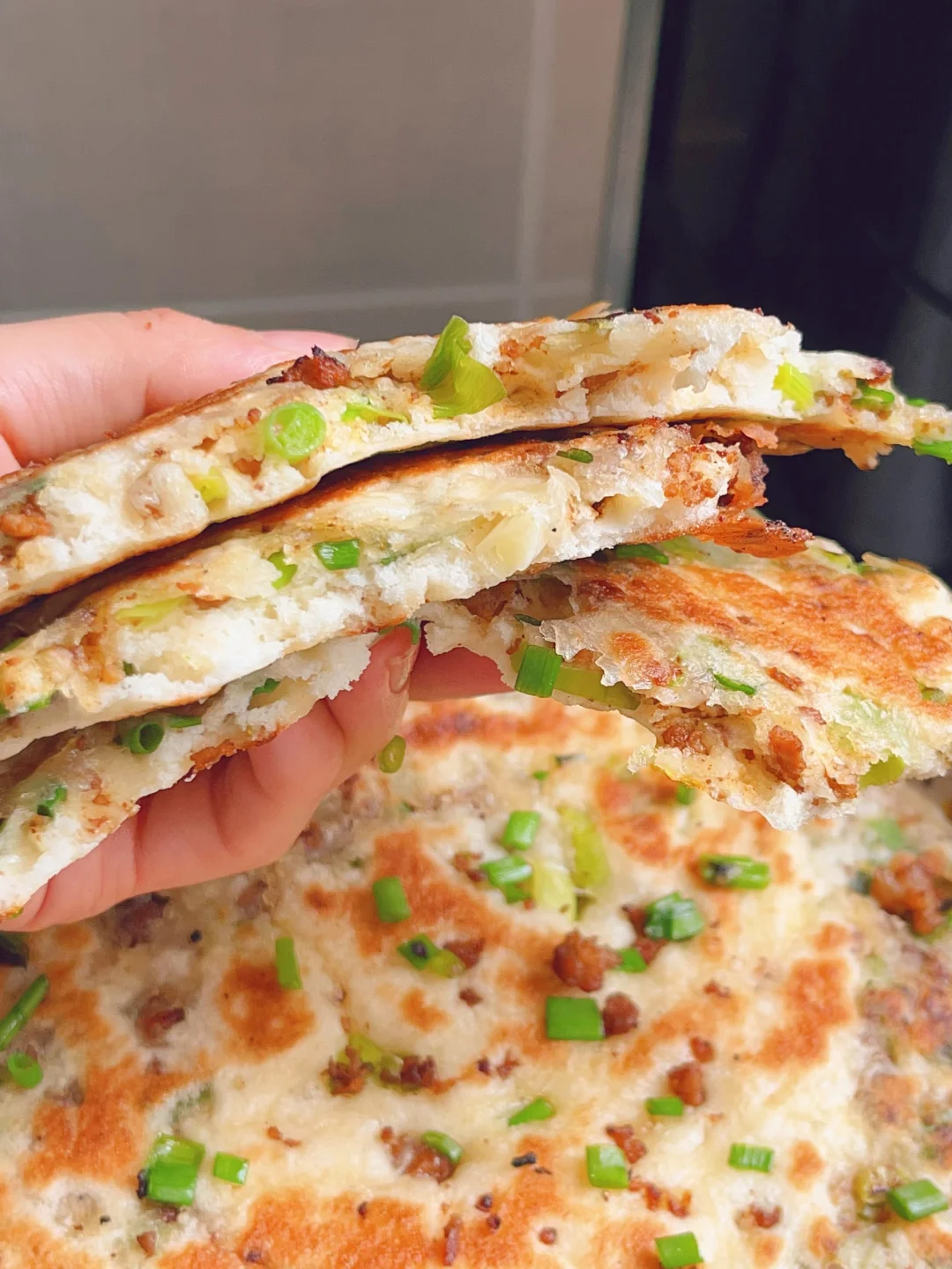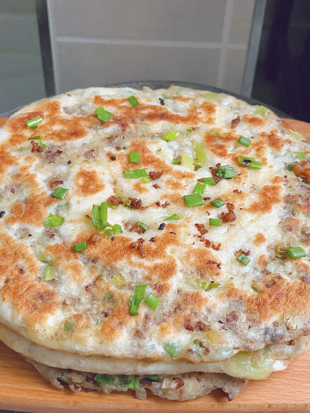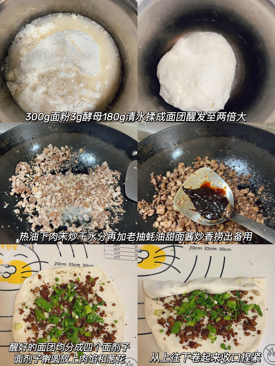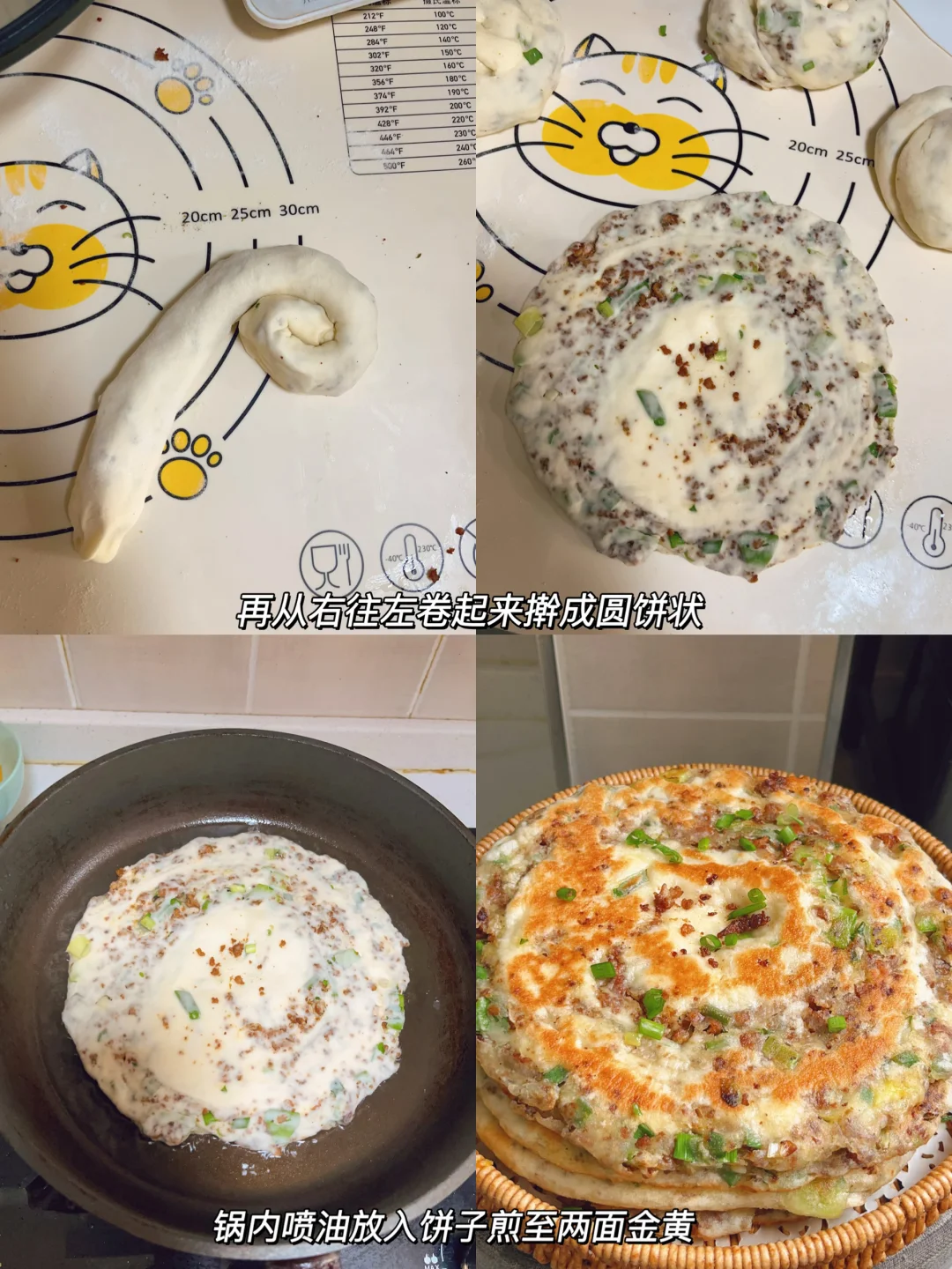 超级香的葱香酱肉发面饼,外酥里软,每一口都是香香的肉 [清单R]食材 300g面粉、3g酵母、180g清水、肉末、葱花 [清单R]步骤 1⃣️面粉加酵母清水揉成面团发酵至两倍大 2⃣️热油下肉末炒干水分,加老抽蚝油甜面酱炒香捞出备用 3⃣️发酵好的面团均分成四个面剂子,面剂子擀成圆饼状,放上肉馅和葱花,从上往下卷起来收口捏紧,再从一端卷起来擀成圆饼状 4⃣️锅内喷油,油热下入饼子煎至两面金黄,饼胚按压回弹