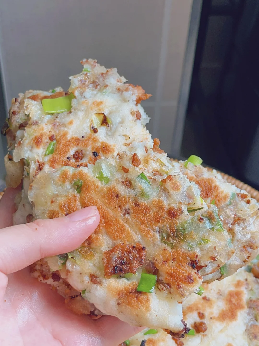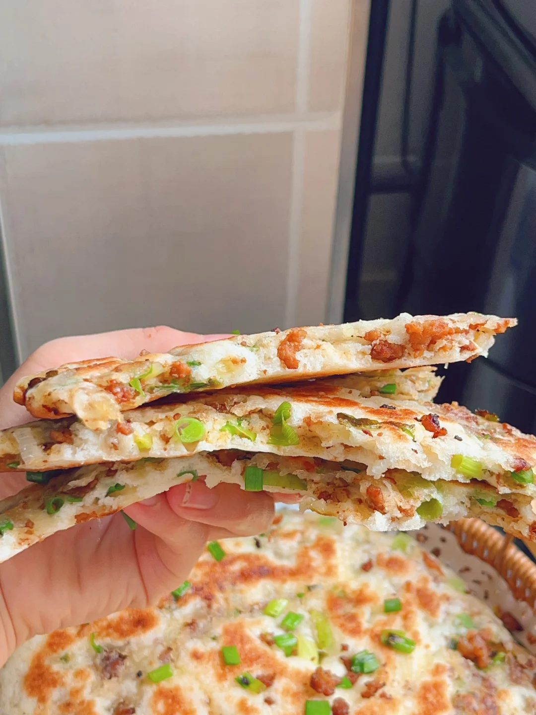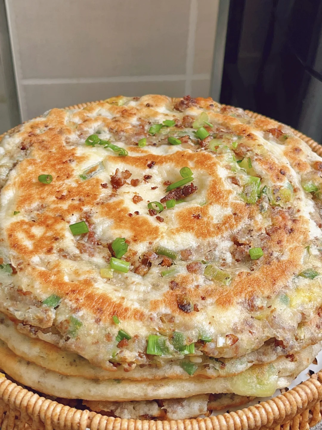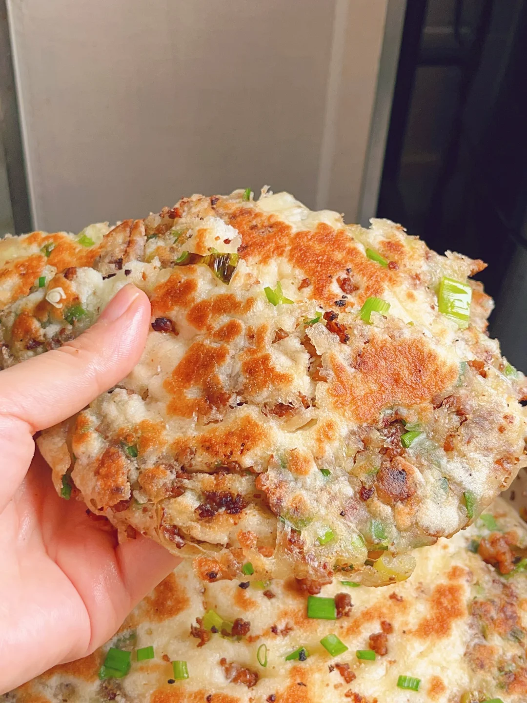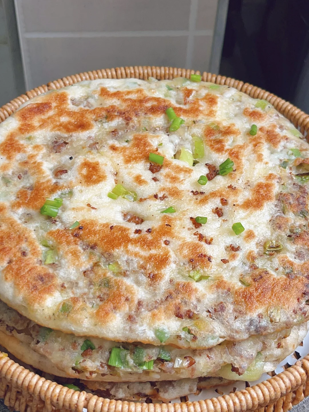 超级香的葱香酱肉发面饼,外酥里软,每一口都是香香的肉 [清单R]食材 300g面粉、3g酵母、180g清水、肉末、葱花 [清单R]步骤 1⃣️面粉加酵母清水揉成面团发酵至两倍大 2⃣️热油下肉末炒干水分,加老抽蚝油甜面酱炒香捞出备用 3⃣️发酵好的面团均分成四个面剂子,面剂子擀成圆饼状,放上肉馅和葱花,从上往下卷起来收口捏紧,再从一端卷起来擀成圆饼状 4⃣️锅内喷油,油热下入饼子煎至两面金黄,饼胚按压回弹