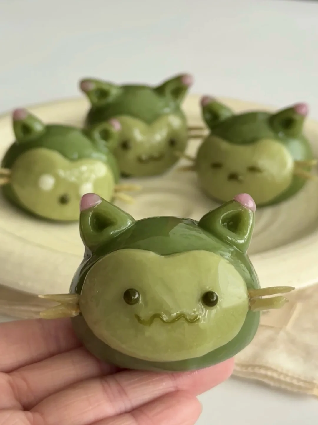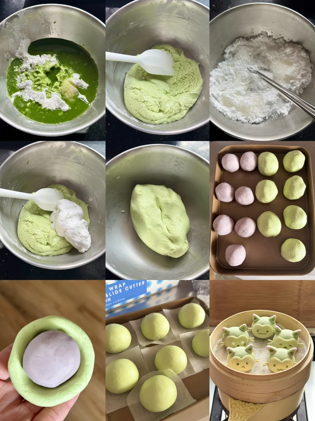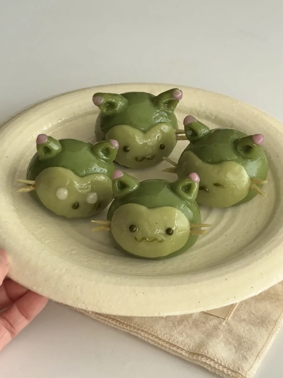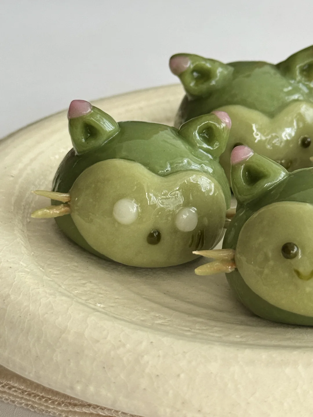 3️⃣另准备一份糯米面团调色,给青团加上喵喵的耳朵和表情