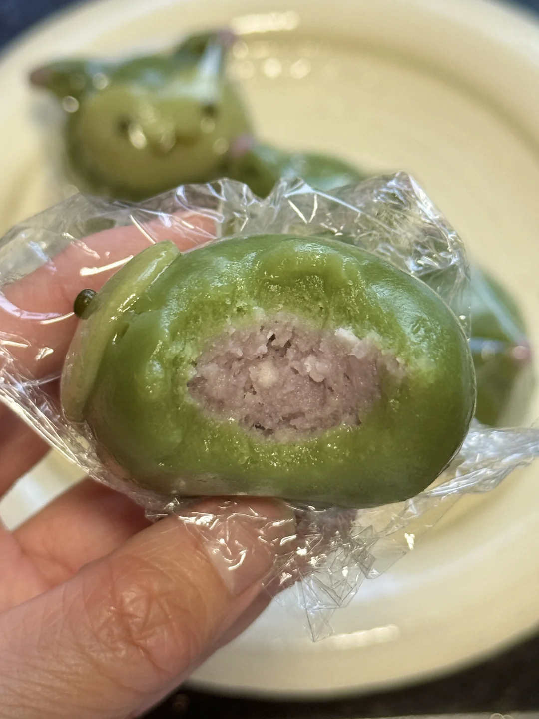 2️⃣澄粉加入开水搅拌成半透明的面团,混合到艾草面团里揉匀,均分成7份,包入提前准备好的芋泥