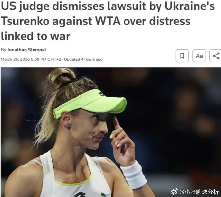 3月27日,外媒指出36岁乌克兰球员特苏伦科针对WTA的起诉已经被驳回。去年4月份,特苏伦科曾起诉WTA,指责对方允许俄罗斯及白俄罗斯选手参加比赛。