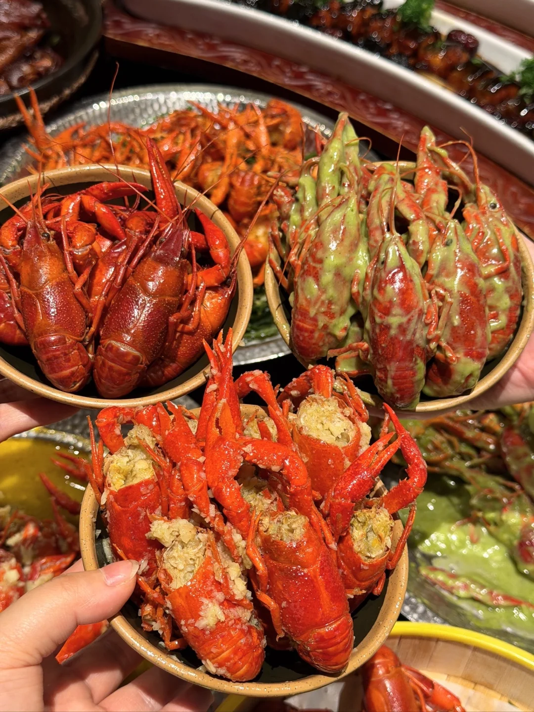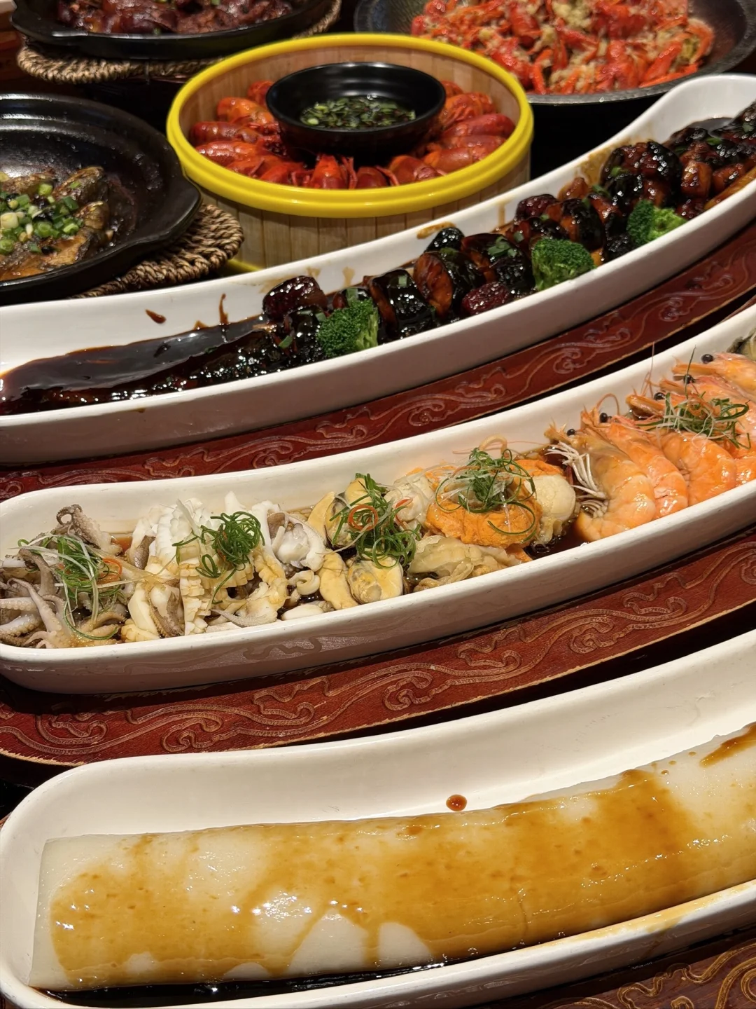 长盘海鲜都是肥嘟嘟的好鲜美啊😢 赶上龙虾季,小龙虾个个肥美爆膏,豆豉黄花鱼、鲳鱼焖饭鲜味十足,现煎纸皮烧卖、纸包排骨、奶茶冰粉大满贯…没有一个不好吃的!!!