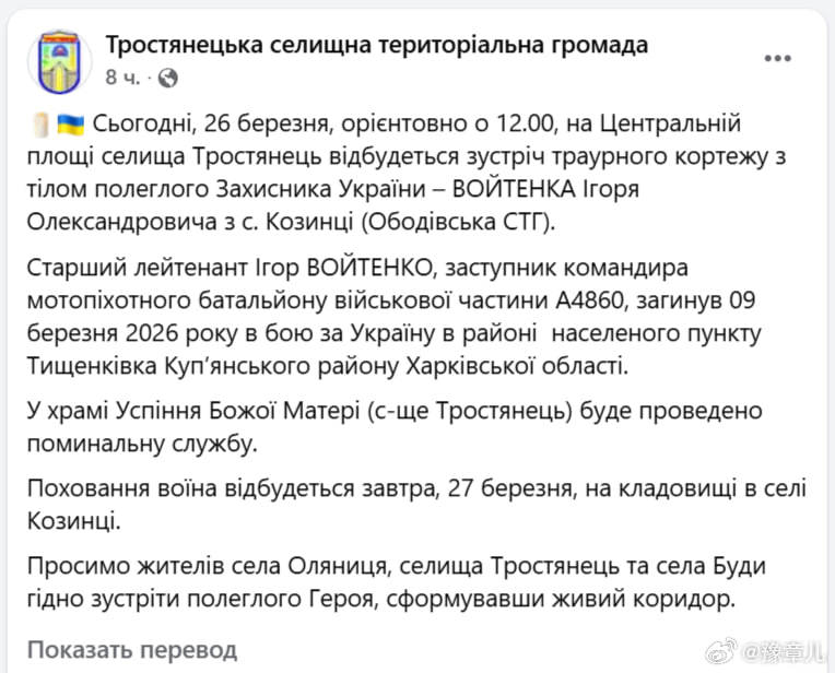 乌克兰武装部队第144机械化旅副营长伊戈尔·沃伊滕科在库皮扬斯克方向被击毙。上尉伊戈尔·沃伊坚科,是第144旅副营长,于2026年3月9日在哈尔科夫州库皮扬斯克区季先基夫卡地区作战时被打死。