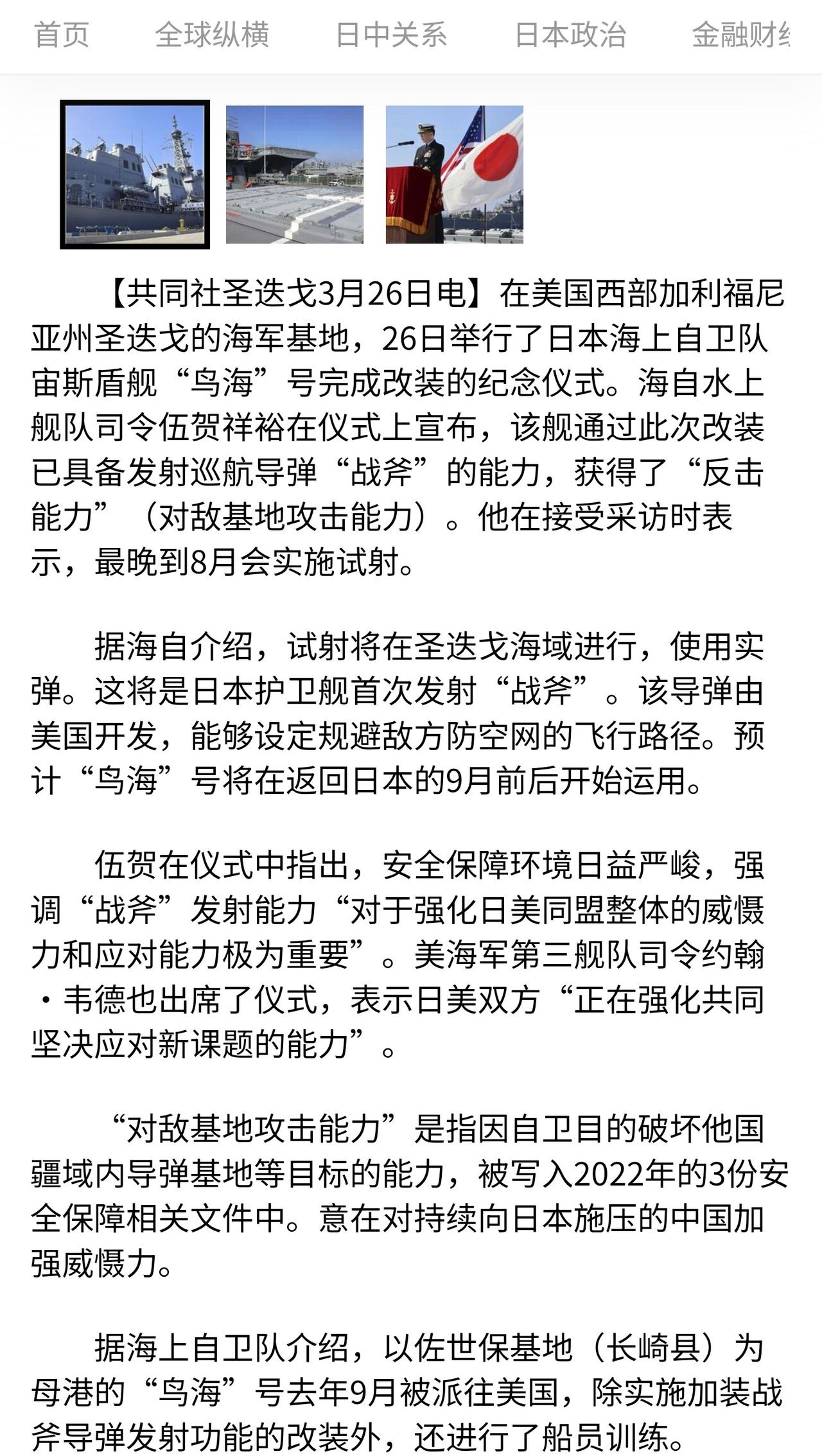 日本鸟海号驱逐舰完成战斧导弹改装,媒体称“反击能力”指向中国 日本金刚级导弹驱逐舰鸟海号成为首艘配置战斧巡航导弹的日本军舰。 当地时间2026年3月26日,在美国西部加利福尼亚州圣迭戈海军基地,举行了日本海上自卫队DDG176鸟海号驱逐舰改装完成仪式。 日本海上自卫队水上舰队司令伍贺祥裕在仪式上宣布,鸟海号驱逐舰通过改装已具备发射“战斧”巡航导弹能力,获得了“反击能力”。 “反击能力”即指“对敌基地攻击能力”,鸟海号驱逐舰发射战斧巡航导弹的目的是远程打程打击敌方陆上目标。 2025年9月,鸟海号驱逐舰被派往美国实施加装战斧导弹发射功能项目。 战斧亚音速巡航导弹射程>1600公里,采用惯性导航、地形轮匹配和卫星制导技术,具备很强的精确打击能力。 鸟海号标准排水量约7500吨,满载排水量约9500吨,舰长161米,舰宽21米。 采用4台LM2500-30型燃气轮机,双轴推进,输出功率约10万马力,最高航速约30节,航程约4500海里/20节。 电子系统包括AN-SPY-1D相控阵雷达、OPS-28水面搜索雷达、OQS-102舰首反潜探测声纳、NOLQ-2拦截与干扰系统。 1架SH-60K反潜直升机。 1门127毫米奥托·梅莱拉主炮,2套20毫米方阵近防武器系统,2座4联装RGM-84鱼叉反舰导弹,2具HOS-302三联装反潜鱼雷发射管。 90单元Mk-41垂直发射系统,兼容SM-2MR舰空导弹、SM-3反导导弹、RIM-162改进型海麻雀导弹、RUM-139反潜导弹、战斧巡航导弹。 2022年,日本将“对敌基地攻击能力”写入3份安全保障相关文件中。 日本共同社的报道声称,此举“意在对持续向日本施压的中国加强威慑力”。 希望日本政府不要重蹈军国主义覆辙,玩火自焚。