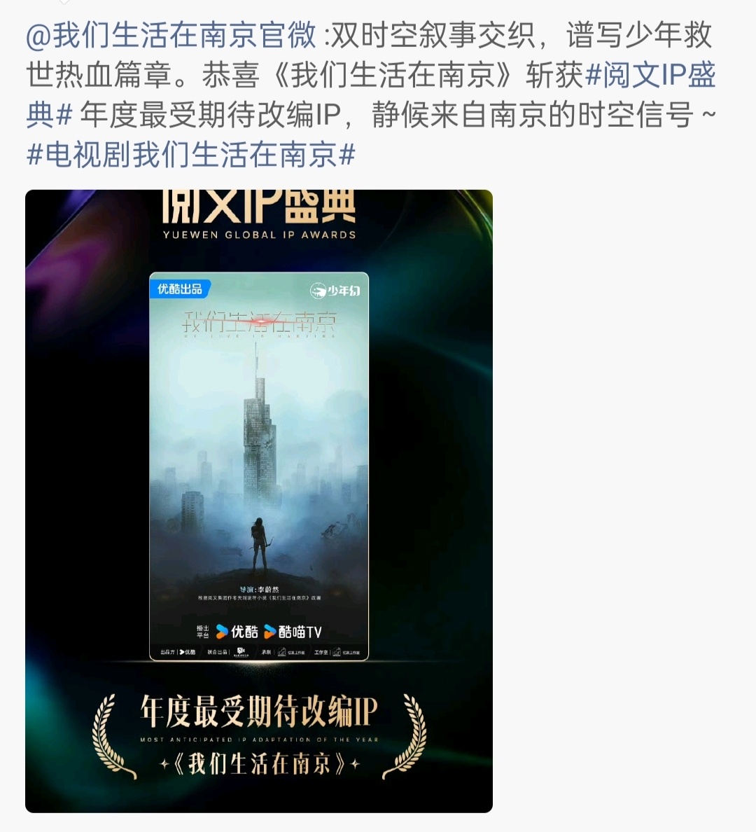 马嘉祺新剧获年度最受期待改编IP恭喜马嘉祺新剧《我们生活在南京》斩获阅文IP盛典年度最受期待改编IP🎉此前还入选2026江苏广电视听重点剧目片单!期待白杨!