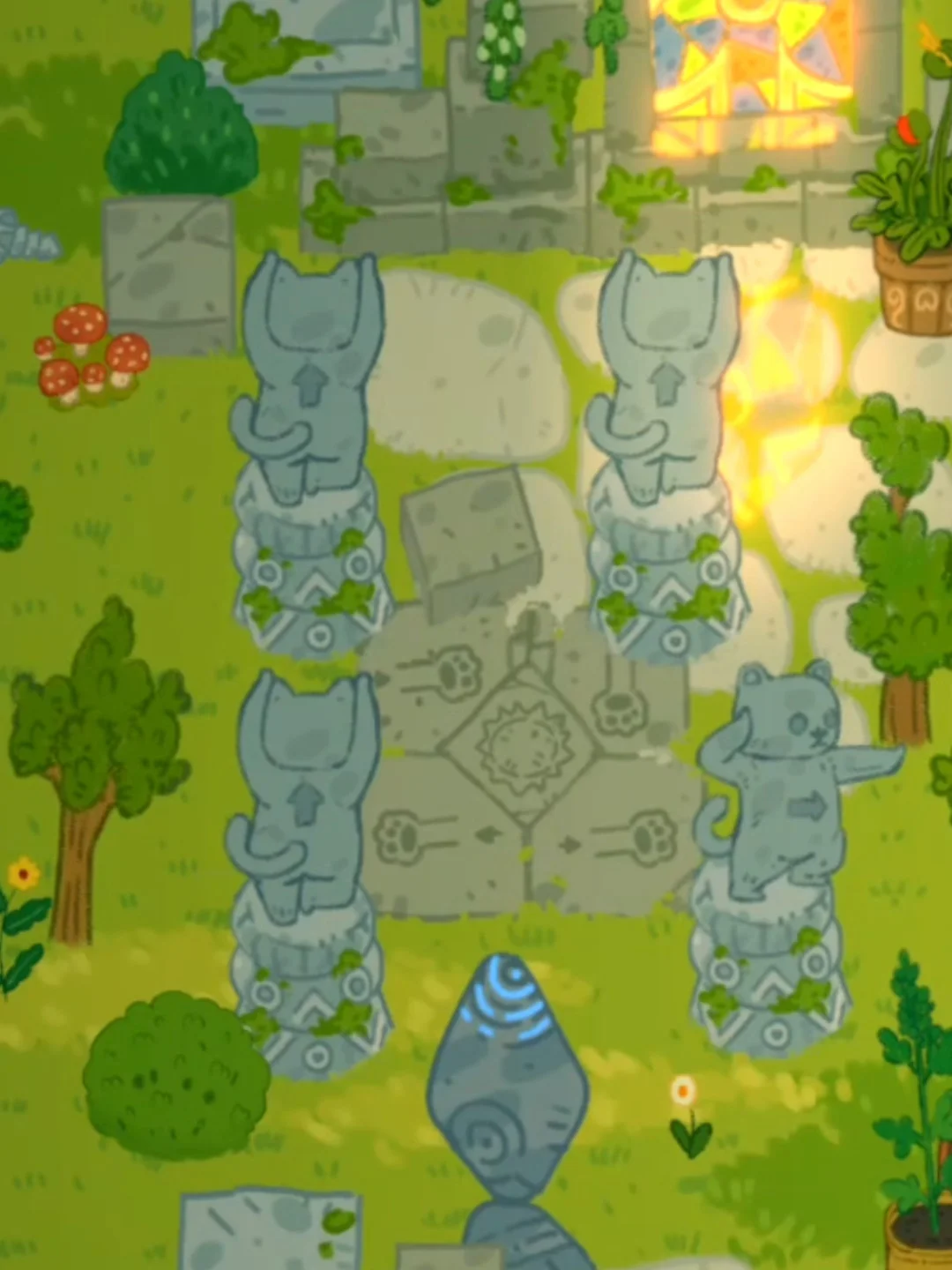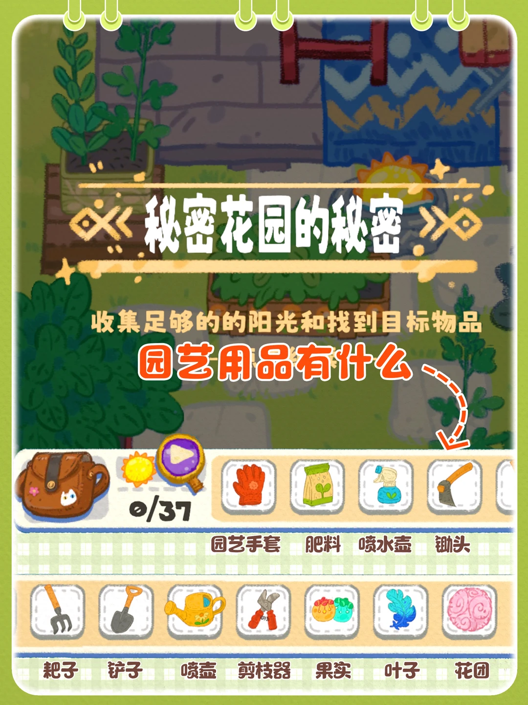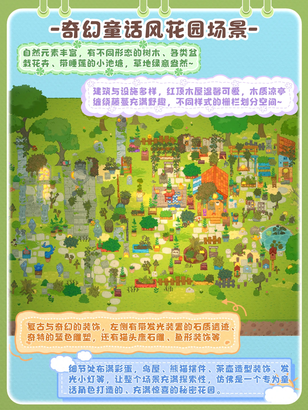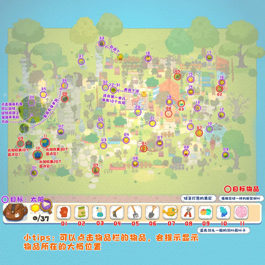 🖼️小小冒险家寻宝记·第1关支线-秘密花园的秘密,塔塔来到一座荒废已久的花园,发现了封印在石像里的猫猫,通过收集足够的阳光和找到相关物品,让花园恢复生机~ ❀游戏内的光影和色调会跟随时间的变化而变化,音乐也好听很治愈~ 🐱这一关有7个互动解谜小场景,都标注在p5啦~