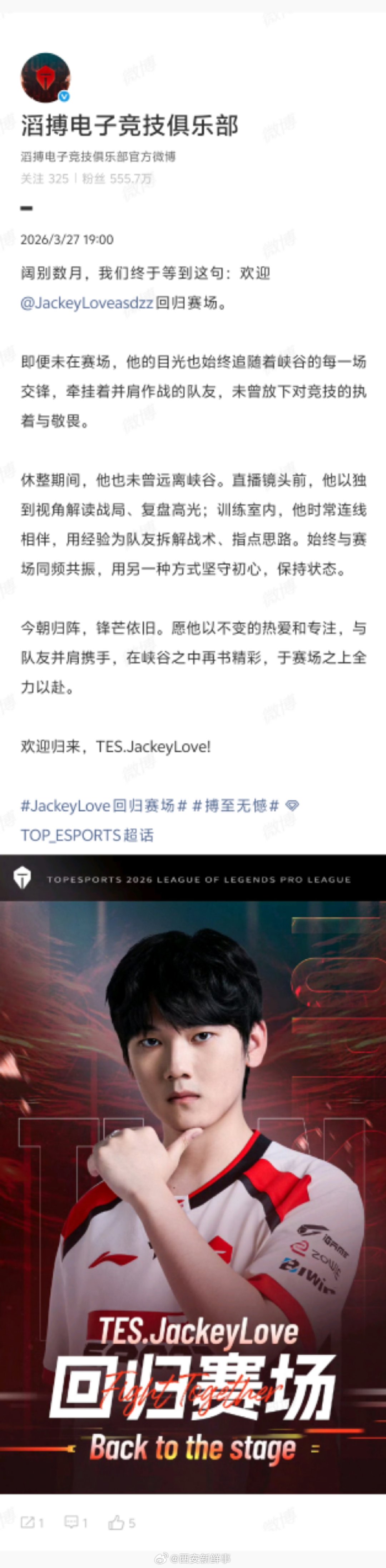 【TES欢迎JackeyLove回归赛场】TES欢迎JackeyLove归来3月27日,发文:阔别数月,我们终于等到这句:欢迎回归赛场。