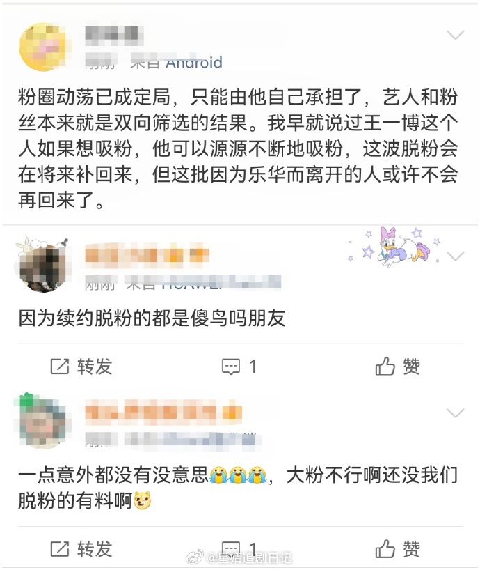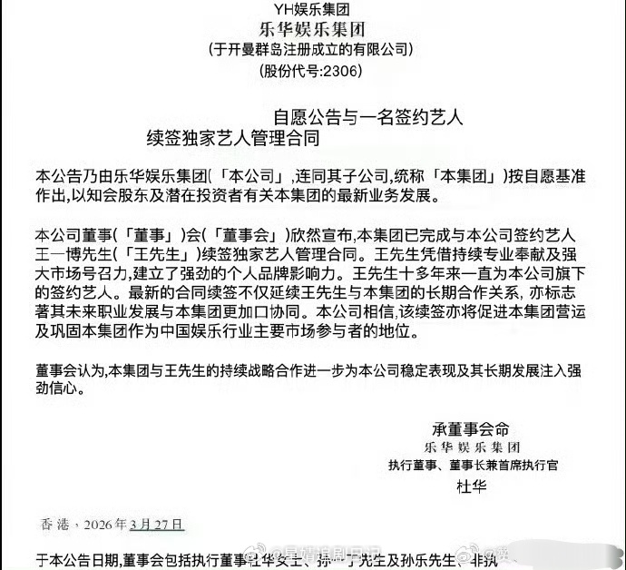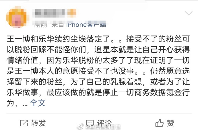 乐华娱乐官网显示,已完成与王一博续签独家艺人管理合同“最新的合同续签不仅延续王先生与本集团的长期合作关系,亦标志着其未来职业发展与本集团更加协同” 王一博真的和乐华预约了 之前就知道乐华想尽办法挽留王一博都没用,到期不续不出意外肯定是势在必行了…现在艺人想恢复自由身是真难啊~要经历多轮拉扯,资源打压和舆论压力,还要提防被使绊子。 因为王一博续约,脱粉gc开始了脱粉王一博微博改名,王一博乐华续约