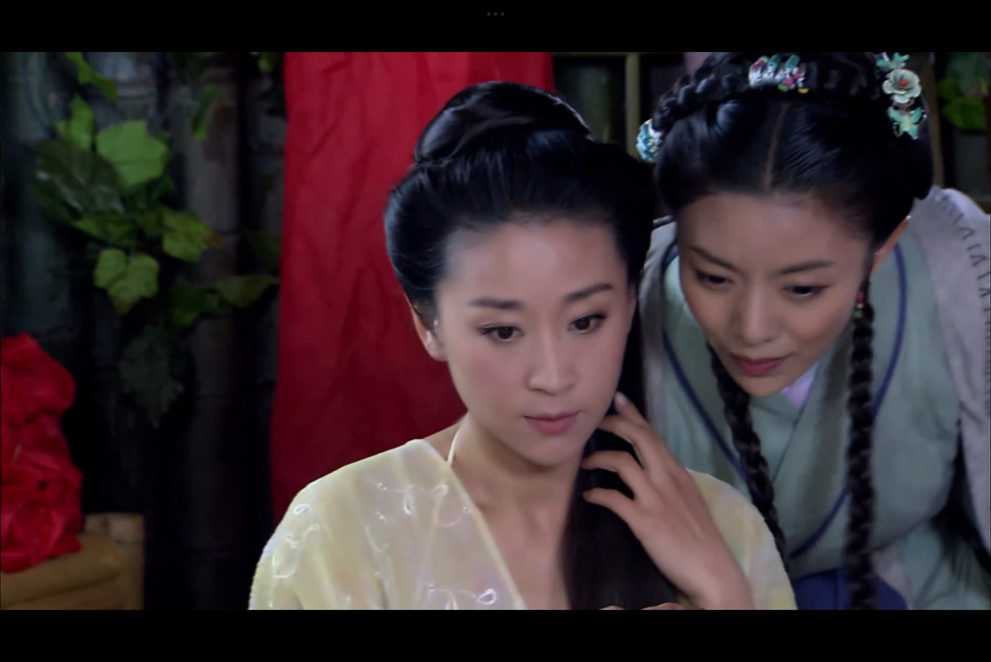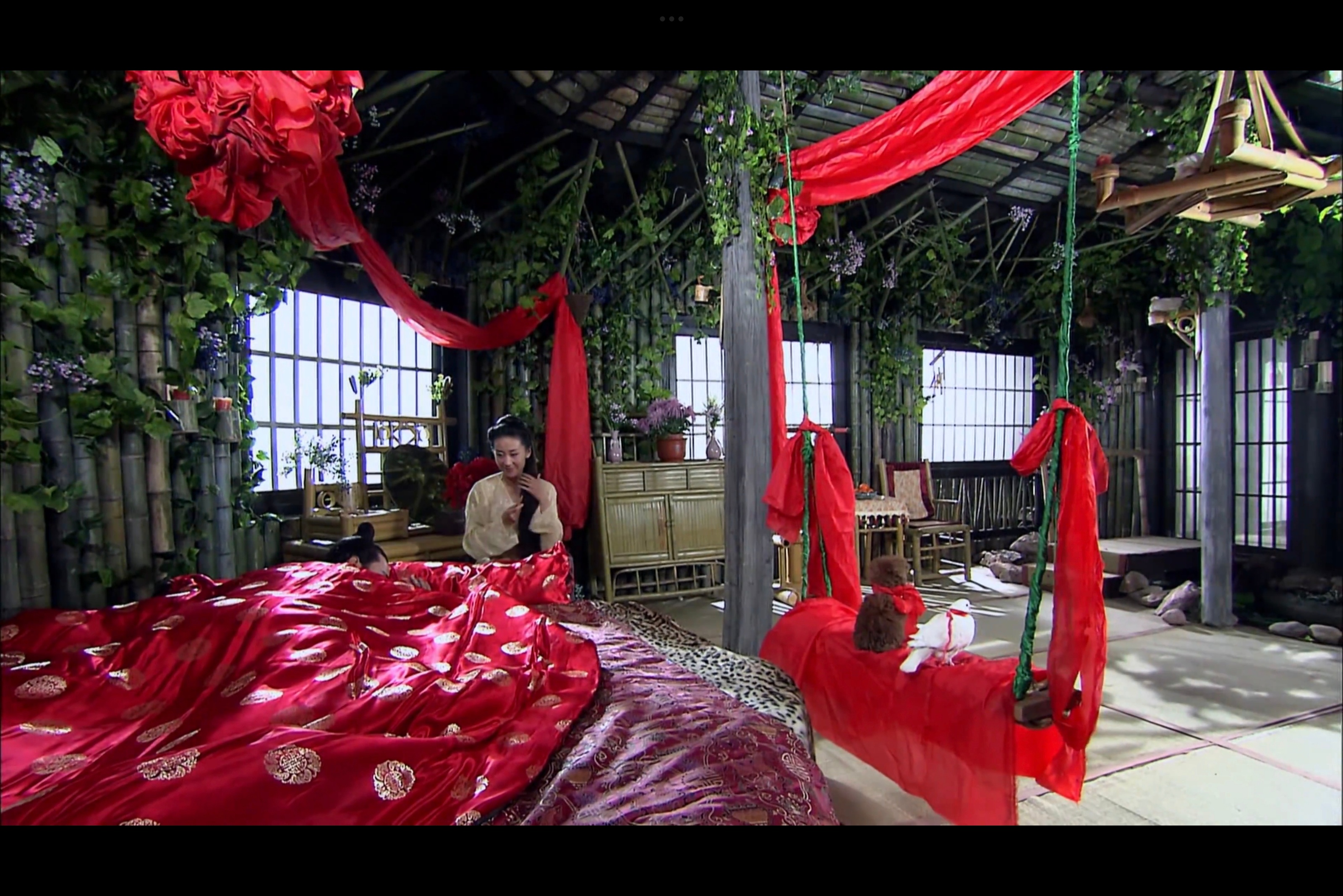穆桂英的穆柯寨、穆桂英的闺房、穆桂英的床。杨宗保不仅在女人的领地里做了夫妻,就连第二天都疲于起身,四仰八叉地睡着懒觉。这又是一个极其颠覆男女固有设定的情节,暖烘烘的婚房里,新婚燕尔的缠绵暧昧氛围,穆桂英依旧是一副当家做主的话事人姿态,好像杨宗保只是她饭桌上多的那道感兴趣且恰好爱吃的菜,于是日日吃也未尝不可。这个造型太温柔似水了, 没有锐气和匪气,轻拢长发、不施粉黛,是姐姐是妻子是妈妈。穆桂英挂帅2012