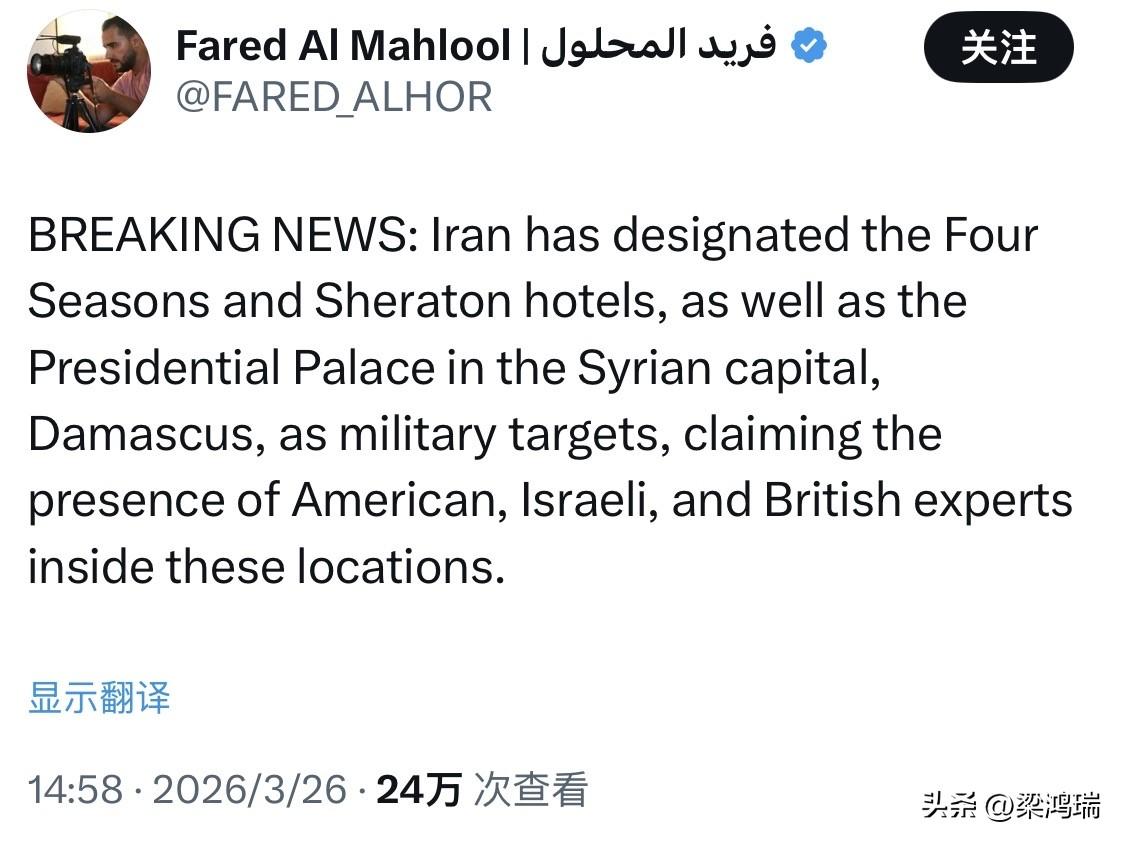 突发新闻:叙利亚自由撰稿人法里德·马赫卢尔表示,伊朗已将叙利亚首都大马士革的总统府列为军事目标 “伊朗已将叙利亚首都大马士革的四季酒店、喜来登酒店以及总统府列为军事目标,声称这些地点内有美国、以色列和英国专家。