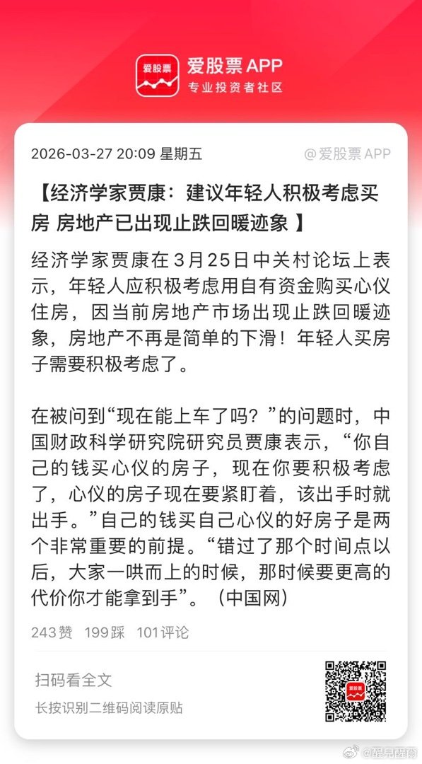 【经济学家贾康:建议年轻人积极考虑买房 房地产已出现止跌回暖迹象 】经济学家贾康在3月25日中关村论坛上表示,年轻人应积极考虑用自有资金购买心仪住房,因当前房地产市场出现止跌回暖迹象,房地产不再是简单的下滑!年轻人买房子需要积极考虑了。 在被问到“现在能上车了吗?”的问题时,中国财政科学研究院研究员贾康表示,“你自己的钱买心仪的房子,现在你要积极考虑了,心仪的... 网页链接这个专家真不靠谱!