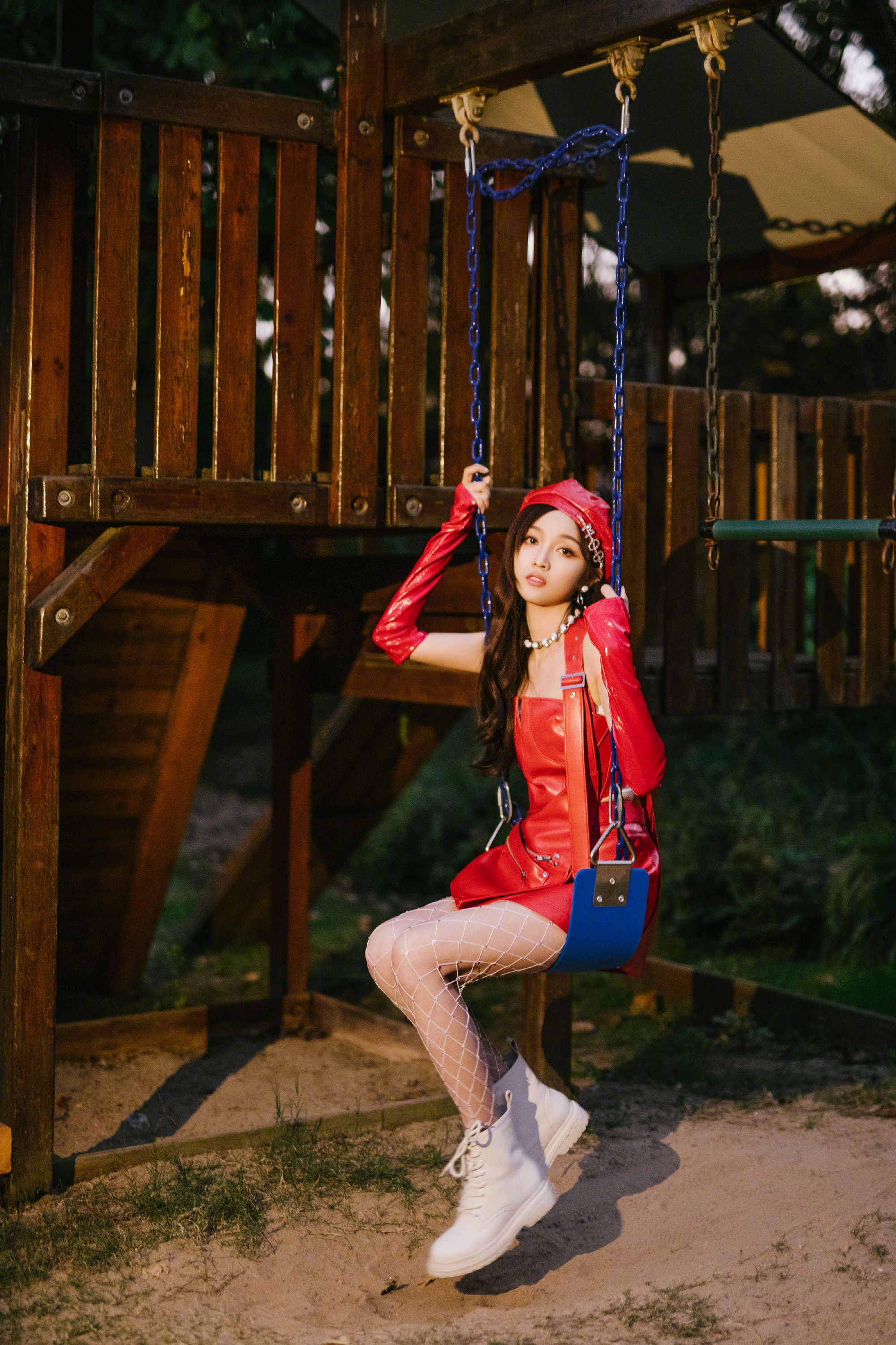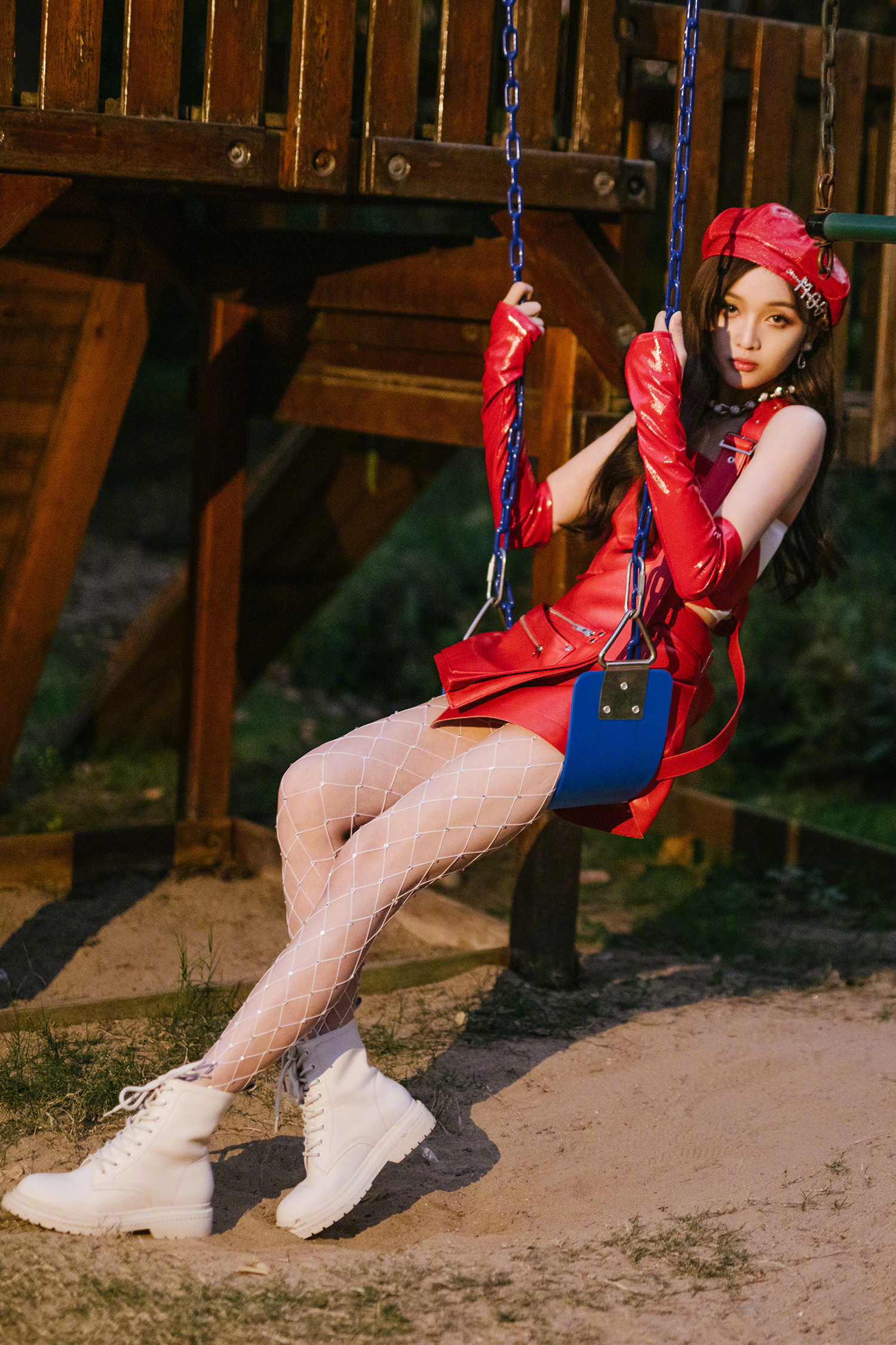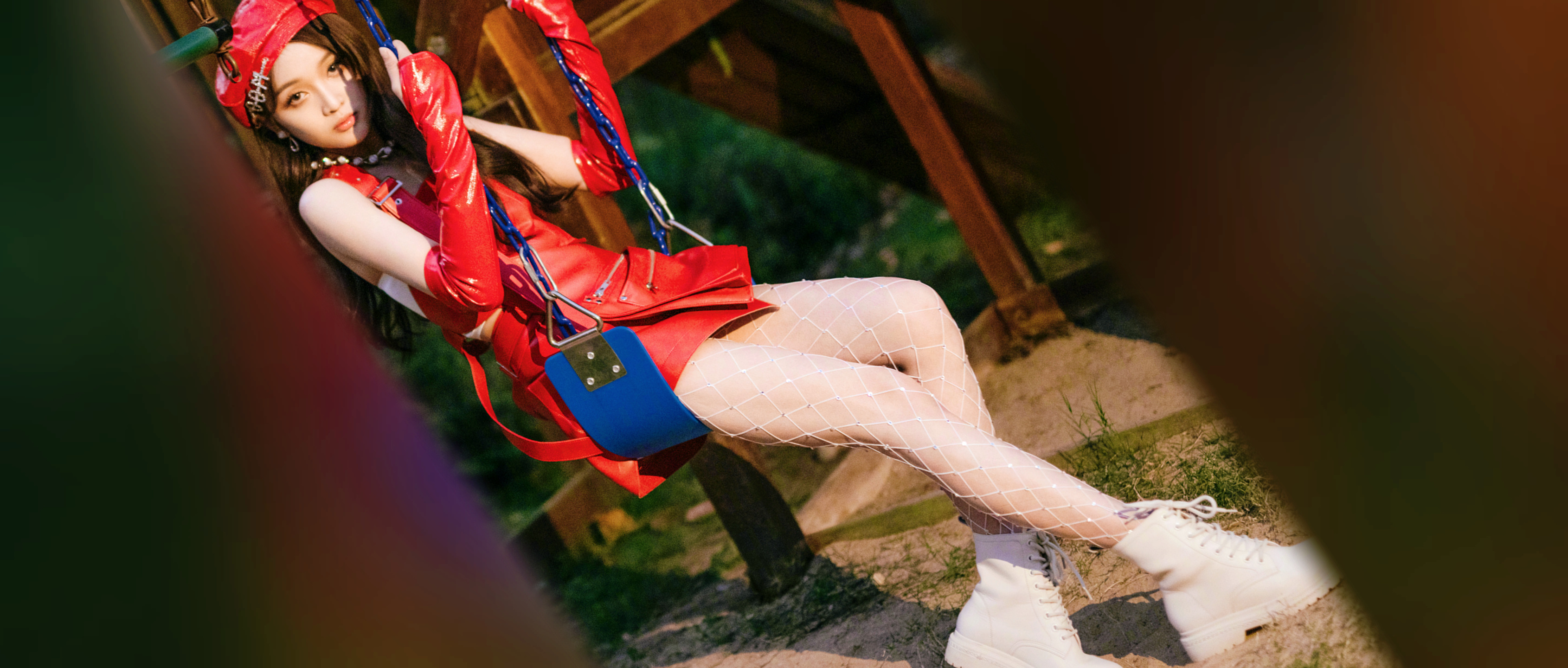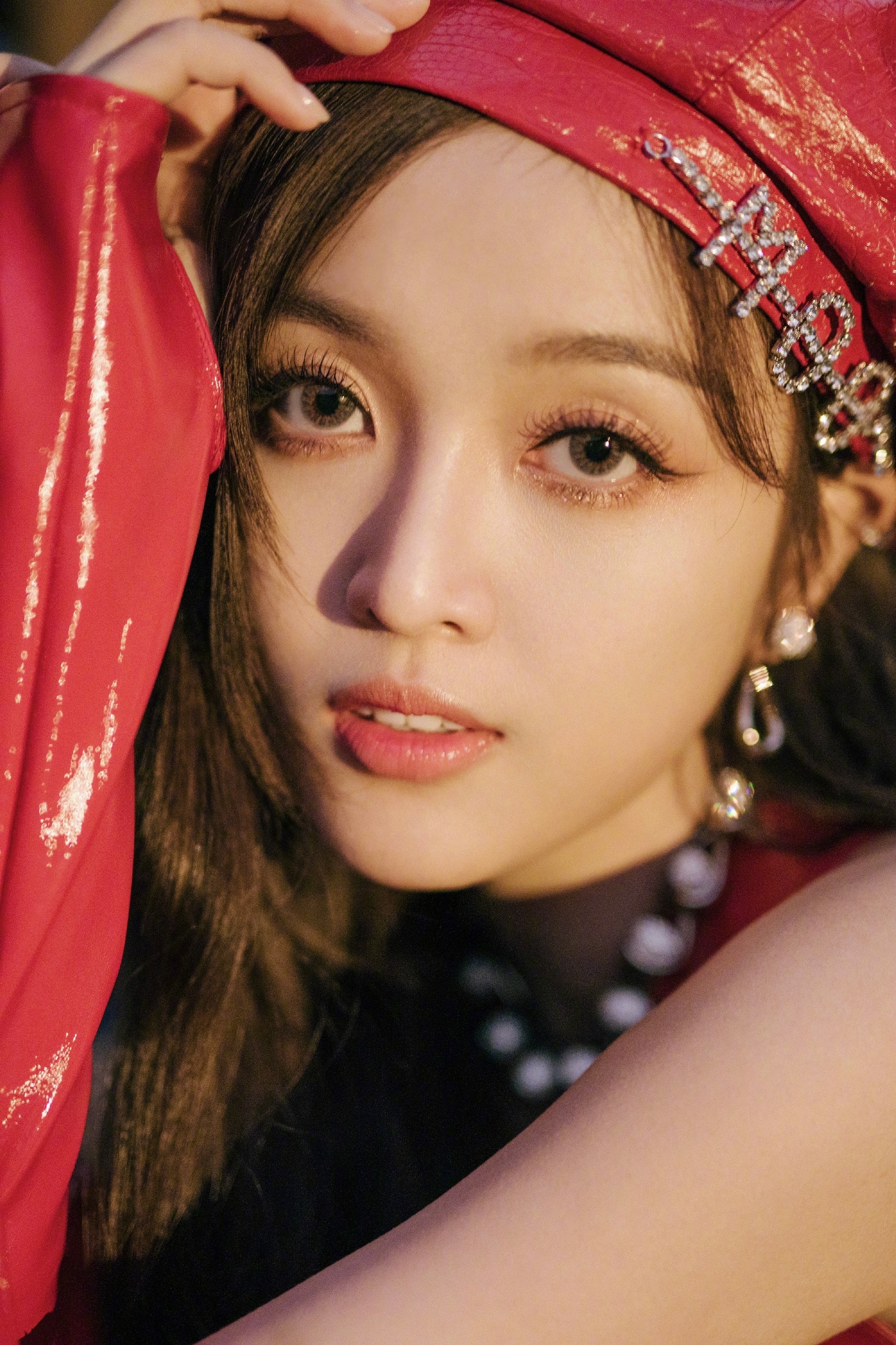吴宣仪,红色皮短裙搭配钻石网袜,复古靓丽的甜酷风格。吴宣仪