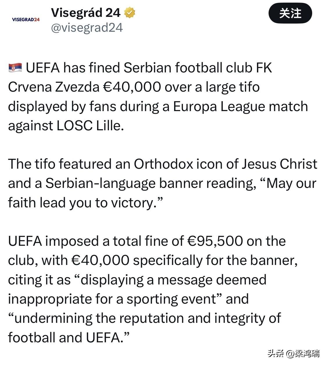欧足联对塞尔维亚足球俱乐部贝尔格莱德红星(FK Crvena Zvezda)处以 40,000 欧元的罚款原因是该俱乐部球迷在欧联杯对阵里尔的比赛中展示了一幅大型横幅。 巨幅横幅上绘有耶稣基督的东正教圣像,以及一条塞尔维亚语横幅,上面写着:“愿我们的信仰引领你们走向胜利。” 欧足联对该俱乐部处以总计 95,500 欧元的罚款,其中 40,000 欧元是专门针对该横幅的罚款,理由是该横幅“展示了被认为不适合体育赛事的信息”以及“损害了足球和欧足联的声誉和诚信”。
