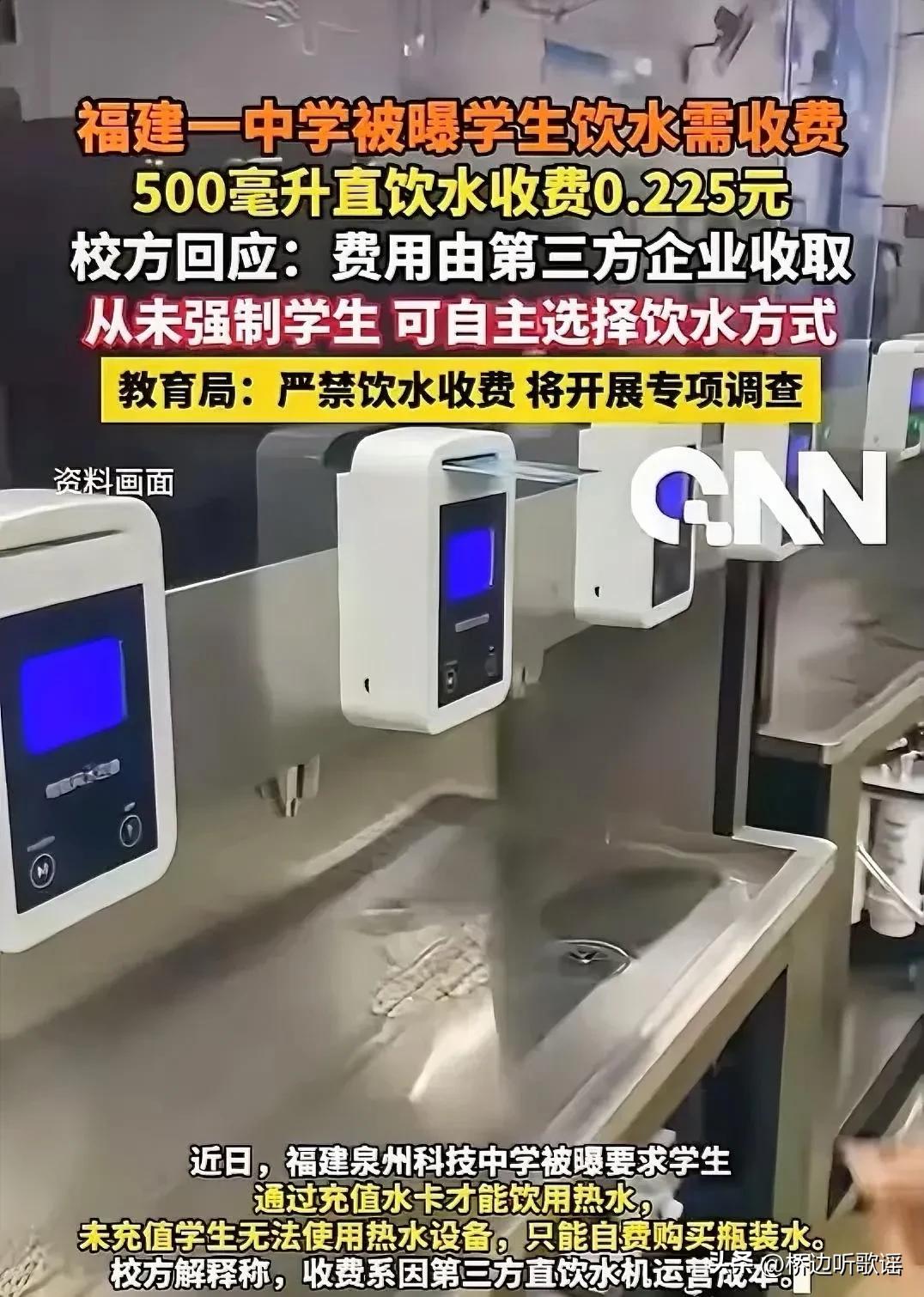 学生喝水也要掏钱!这件事情被曝光之后,学校说,水费是第三方公司收的。这个借口找的妙哇。那么,这就要问了:第三方公司是怎么堂而皇之进入学校收费的? 在很多人的印象里,校园本应该是简单纯粹的地方,学生在校的基本生活保障,理应由学校统一负责,不应该凭空多出各种收费名目,更不至于连正常喝水都要额外花钱。 近些年,校园里很多服务都开始外包,食堂、超市、直饮水、洗衣设备等,大多交给外面公司运营。本来是为了提升服务、减轻学校管理压力,初衷并没有太大问题。 但慢慢很多事情都变了味,部分外包项目不再以服务学生为目的,反而变成了一门稳定生意。不少商家盯上校园流量,想尽办法进场,把学生的日常需求当成盈利点。 直饮水就是很典型的项目,学校装上净水设备,学生扫码付费喝水,看上去方便快捷,背后却藏着不透明的合作关系,很多家长根本想不到,喝水也要按次计费。 事情被曝光之后,不少家长都觉得难以接受。孩子在学校正常上学,连最基础的饮用水都不能免费保障,还要单独花钱,明显超出了大家对校园服务的正常认知。 面对外界质疑,学校第一时间把责任推给第三方,声称收费和校方无关,都是外包公司在操作,学校只提供场地,不参与定价,也不负责具体管理。 这套说法听起来似乎说得通,可稍微细想就站不住脚。第三方公司没有学校许可和授权,根本不可能进入校园安装设备、面向学生公开收费。 一家企业想要入驻校园,必须经过洽谈、签约、审批、进场等完整流程。合作内容、收费标准、运营方式,每一步都需要学校点头同意,不可能完全脱离监管。 所谓不知情、不参与,更像是一种刻意推脱。学校是校园管理的第一责任人,对校内经营行为负有监督义务,不能一出问题就拿第三方当挡箭牌。 家长真正在意的,从来不是几块钱水费,而是收费是否合理、是否透明。学生在校园里没有选择权,学校提供什么就只能接受什么,很容易出现不合理收费。 校园直饮水成本并不算高,完全可以纳入学校日常公共支出。就算确实需要收费,也应该由学校公开核算、明码标价,而不是交给外包公司随意设定价格。 更让人担忧的是,如果喝水收费被默许,后续很可能出现更多收费项目。公共用电、卫生使用、基础服务,都有可能一步步变成盈利项目,让校园逐渐商业化。 教育本身带有公益属性,校园不应该成为逐利的地方。学校的核心职责是教书育人,保障学生正常学习生活,而不是放任商家进场,盯着学生日常开销赚钱。 外包模式本身没有问题,问题出在监管缺位、责任甩锅。有些学校把项目一包了之,只图省事方便,却忽略价格监督、服务规范,最终伤害的是学生和家长。 相关部门也应该对校园外包服务加强约束,明确哪些项目可以收费、哪些属于基础保障,合作流程、定价标准都要公开透明,不能任由学校和商家自行决定。 很多校园乱象反复出现,就是因为约束不够、监管不严。只有规则清晰、监督到位,才能压缩不合理盈利空间,不让商家把手随意伸进校园。 这件小事,恰恰暴露了校园管理的漏洞。用第三方来推卸责任,看似巧妙,实则不负责任。学校该承担的监管责任,不能用一句外包就轻轻带过。 学生在校的基本权益,必须得到最基础的保障。干净安全的饮用水,是最平常的生活需求,不该被当成生意来做,更不能让学生为不规范收费买单。 大家真正失望的,不是收费本身,而是学校遇事甩锅的态度。学校本该坦诚面对问题、及时整改,而不是找借口、推责任,一点点消耗家长的信任。 校园管理越公开透明,家长才会越安心。涉及学生的所有收费,都应该摆在明面上,讲清依据、公布标准,主动接受监督,而不是藏在外包背后模糊处理。 这种现象在不少学校都存在,只是很多没有被曝光。这也提醒所有学校,别把校园服务变成牟利工具,别总把第三方当成推卸责任的万能理由。 教育的底色是公益,校园的核心是育人。守住底线、管好乱象、担起责任,才能让学生学得安心,让家长真正放心,让校园回归简单干净的本来样子。 各位读者你们怎么看?欢迎在评论区讨论。