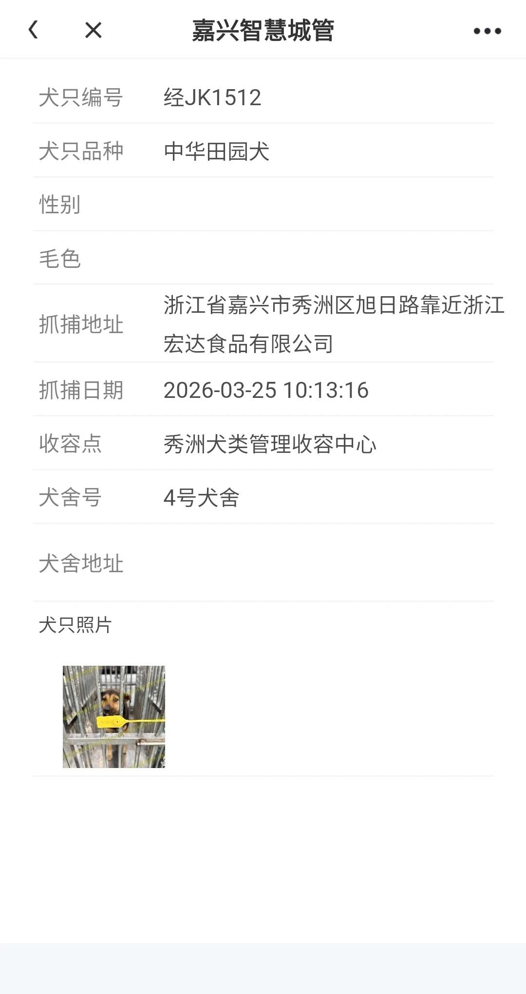 浙江浙里办嘉兴(经开区)2026.3.26犬只收容 嘉兴经开区寻狗 嘉兴秀洲区寻狗 浙里办嘉兴经开区的公示1只狗狗,抓捕地秀洲区旭日路靠近浙江宏达食品有限公司,收容在秀洲区。只有三天公示时间 转自浙江浙里办小程序,嘉兴秀洲经开区找狗进入浙里办小程序,搜索找到嘉兴智慧城管~嘉兴犬管~选择经开区~自主申办~认领公告。时间紧迫。嘉兴犬管公示包括南湖区,秀洲区,经开区,嘉善县,平湖市,海盐县,桐乡市,港区。浙江省嘉兴市寻狗 嘉兴秀洲区 秀洲区寻狗 秀洲区