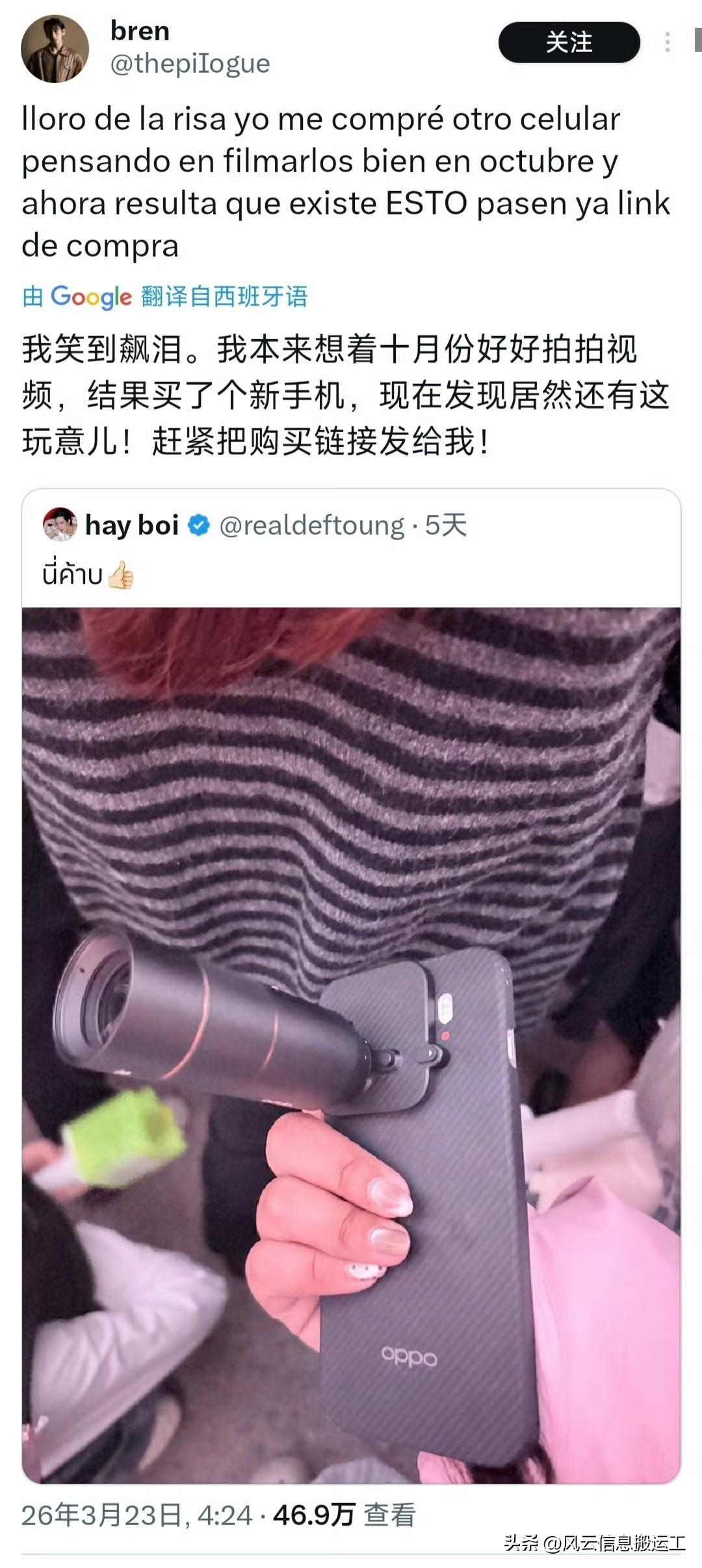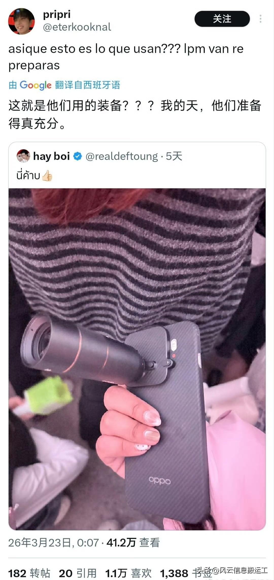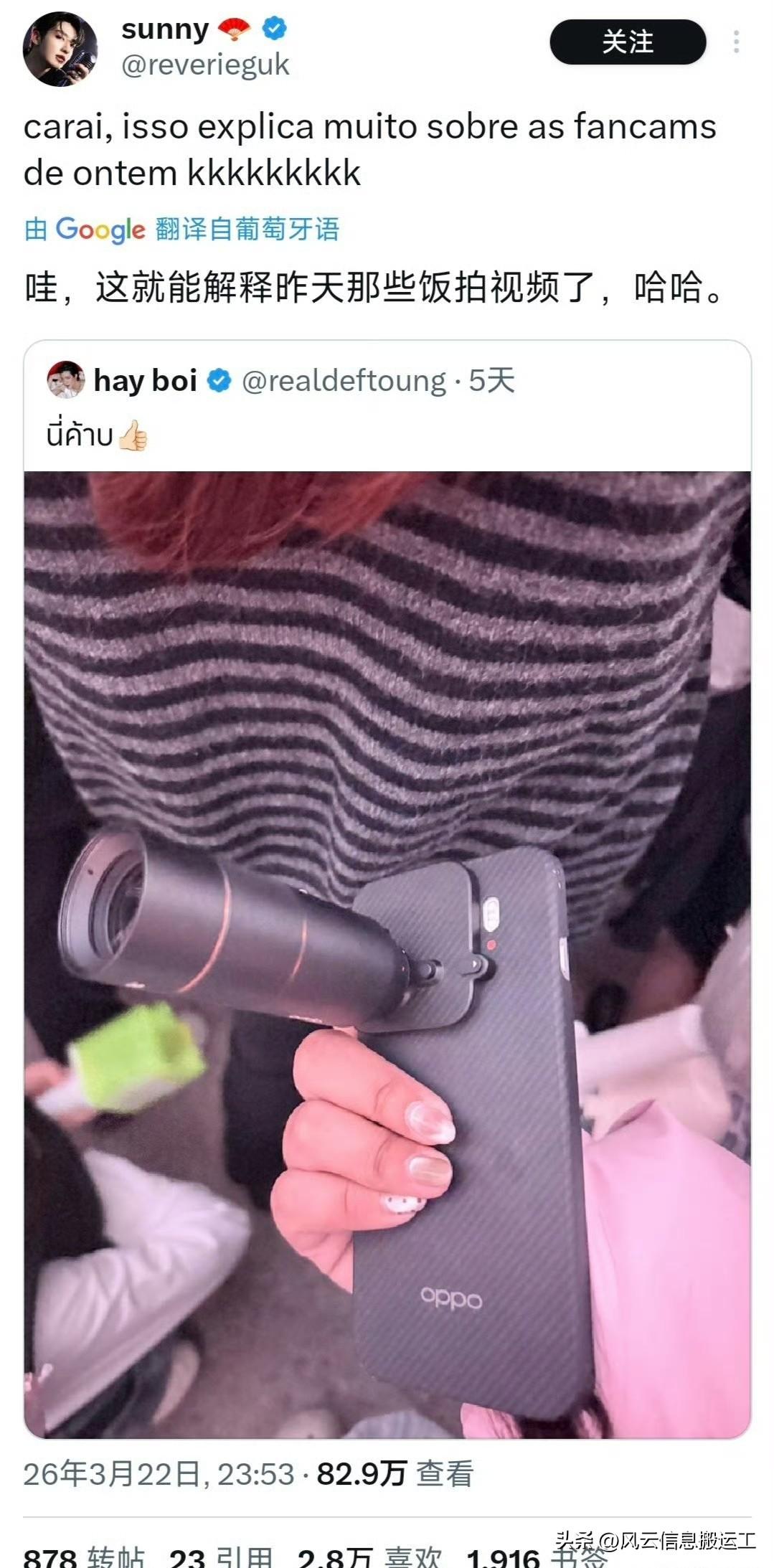 推特上一位韩团的泰国粉丝,因为用oppo手机,拍出超清晰饭拍视频,而引起其他粉丝热议 !(10799 雷亚尔 ≈ 14,246.70 元人民币,oppo国外卖的好贵!)