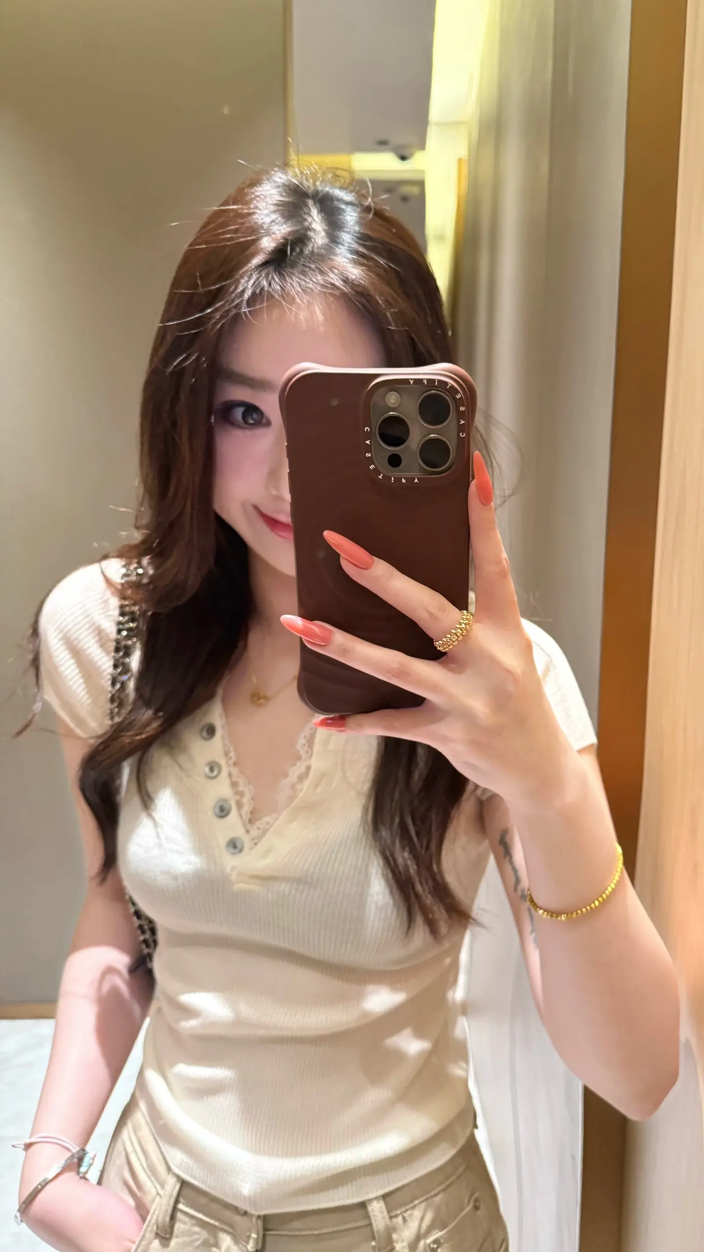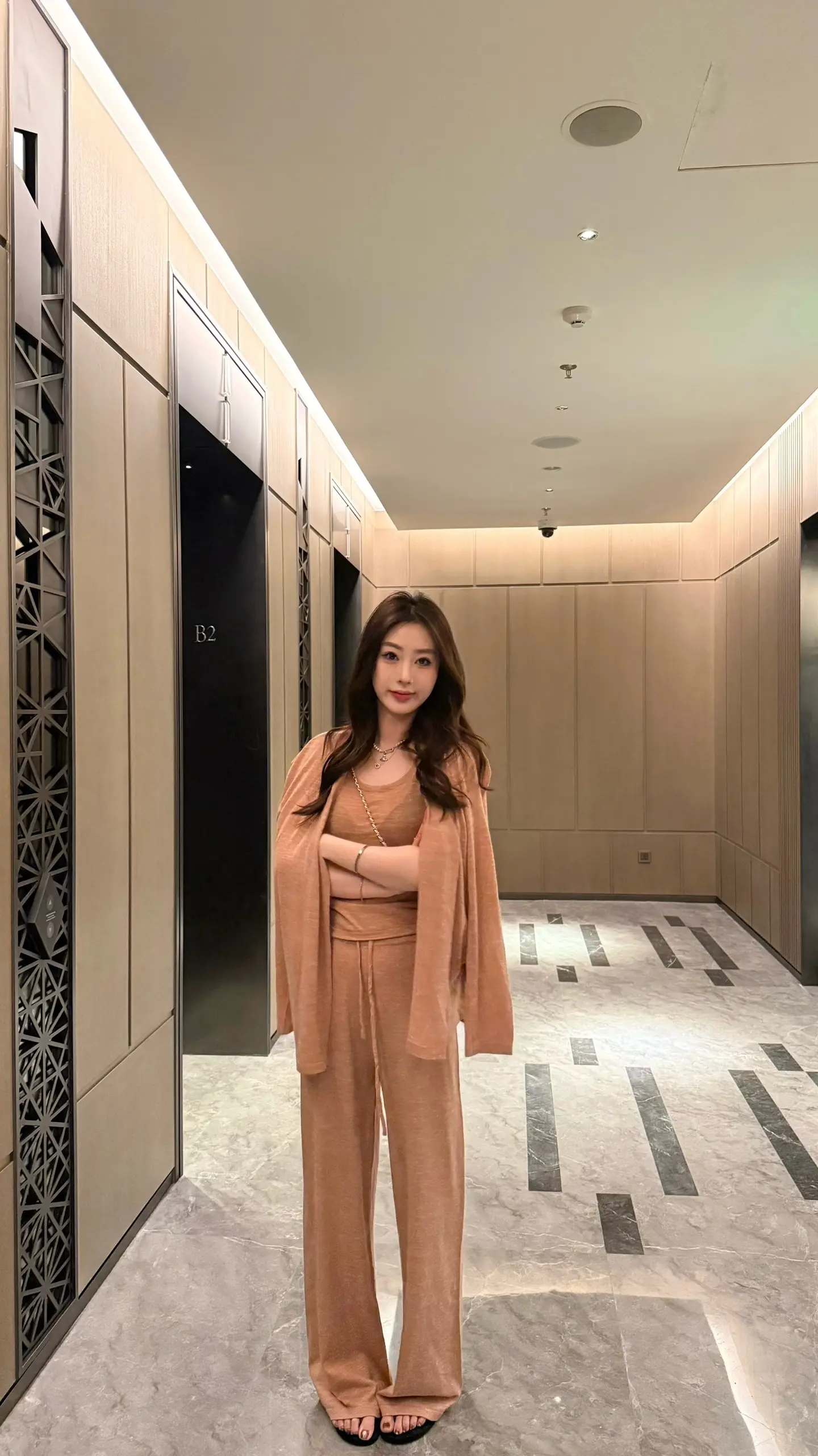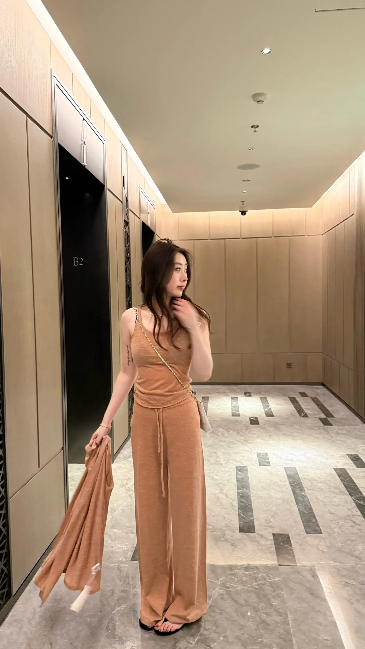 慵懒午后,浅紫色内衣搭配米色外套,舒适自在。