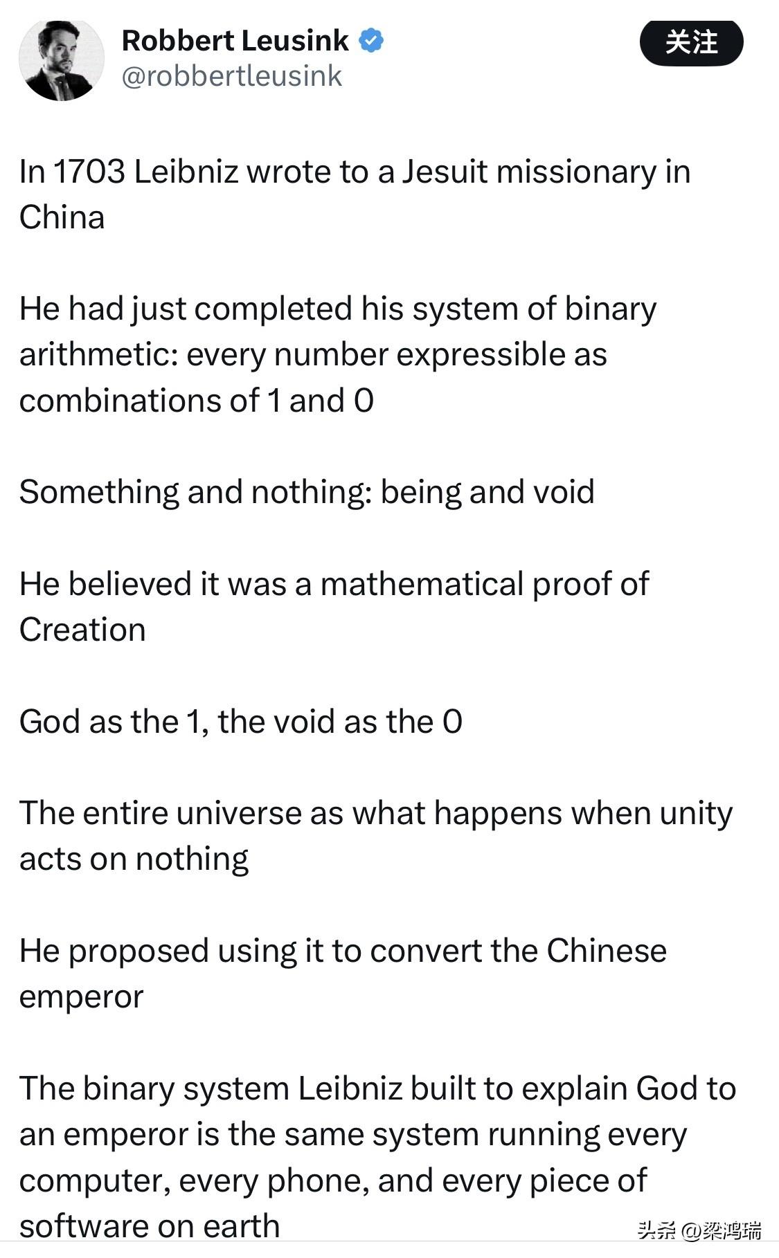 17 世纪末,德国哲学家和数学家戈特弗里德·威廉·莱布尼茨(Gottfried Wilhelm Leibniz)正式完善并记录了二进制(Binary arithmetic)系统。 他在 1703 年发表了著名的论文《关于仅使用符号 0 和 1 的二进制算术的解释》(Explication de l'Arithmétique Binaire)。他认为一切事物都可以用 0(无/虚无)和 1(有/上帝)来表示。这种逻辑极大简化了运算规则,为后来的计算机科学奠定了数理基础。 灵感来源:莱布尼茨曾与传教士交流,发现中国古代的《易经》六十四卦符号序列与他的二进制逻辑惊人地吻合,这让他坚信二进制具有普世的哲学意义。 硬件设想:他曾构思过一种使用小球和凹槽来工作的“二进制计算器”,虽然当时并未实际建成,但其原理与现代计算机的物理逻辑如出一辙。 莱布尼茨的二进制不仅是一项数学发现,更是将逻辑学与数学计算结合的里程碑。