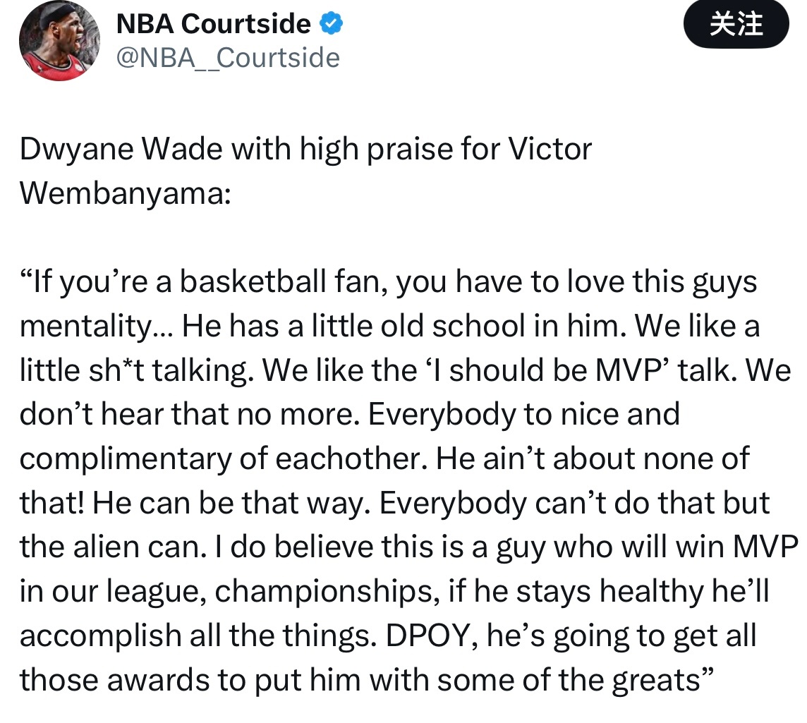 NBA名宿韦德在节目中赞赏文班亚马👽