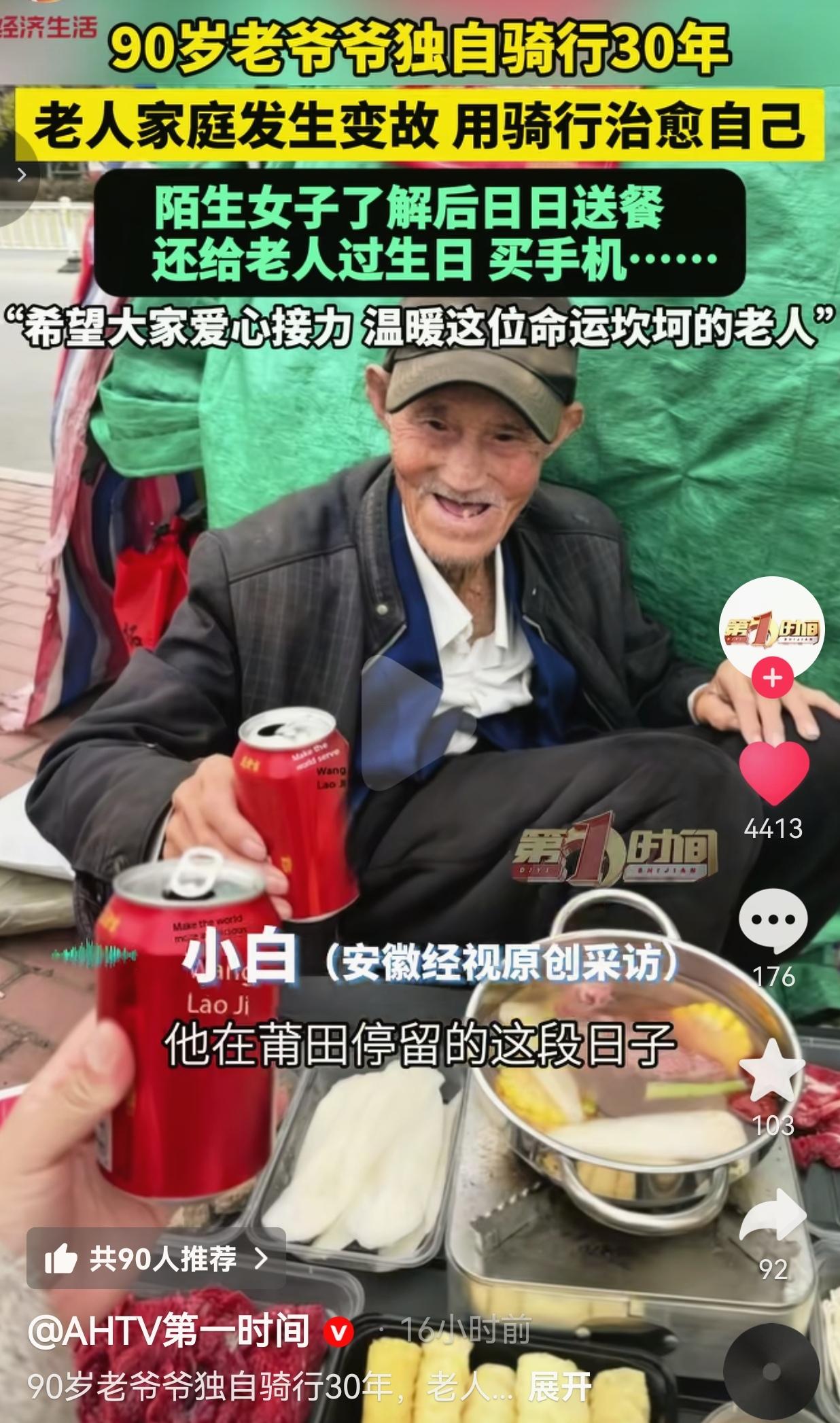 90岁爷爷骑行30年,家破人亡后靠车轮治愈自己!陌生女子日日送饭,看完我哭了! 事情是这样的:30多年前,一场车祸夺走了爷爷的儿子一家三口,第二年,老伴也走了。一夜之间,这个家没了,人没了,天塌了。 他没哭天抢地,只是推起一辆旧自行车,把铺盖往车上一捆,从此四海为家。 沿着县道,从北到南,车轮碾过泥泞,也碾过他心里的痛。饿了就啃干粮,累了就在车棚里搭个蓝布帐篷睡,风里雨里,一骑就是30年。 今年他到了福建莆田,被一个陌生姑娘撞见了。 姑娘看着他在帐篷里啃冷饭,红了眼,从此天天给他送饭:排骨饭、鸡蛋糕、热汤,变着花样来。 知道他孤单,姑娘给他买了老人机,交了一年话费;知道他生日,特意订了个带寿桃的蛋糕,陪他吹蜡烛。 爷爷说:“是骑行治愈了我,现在又有你们疼我,我这老头子,值了。” 可我们都知道,他这30年,是把眼泪咽进肚子里,靠两个车轮,硬生生把破碎的日子,骑成了一条活路。 网友看到后评论说:“90岁还在骑车,不是闲得慌,是没家可回啊!看得我鼻子发酸,这姑娘是真菩萨!” 也有的网友说:“我在莆田见过他!瘦得只剩一把骨头,但笑起来特别暖!姑娘你是好样的,好人有好报!” 还有的网友说:“我骑过川藏线,都没他苦!他骑的不是车,是对家人的念想,是活下去的盼头!” 也有的网友说:“家破人亡还能活成这样,爷爷比谁都坚强!这姑娘的饭,暖的是胃,救的是心!” 90岁啊,本该是含饴弄孙的年纪,他却在车轮上颠沛了30年。 有人说他洒脱,可谁愿意无家可归?有人说他坚强,可谁知道他深夜在帐篷里,会不会摸着老伴的旧照片掉眼泪? 最让我破防的是那个姑娘:她不是什么大老板,只是个普通人,却愿意把温柔给了一个素不相识的老人。 日日送饭,买手机,过生日,这些小事,比任何捐款都戳心——因为她把爷爷当亲人疼。 有人说“可怜之人必有可恨之处”,可爷爷可恨在哪? 他没偷没抢,没麻烦任何人,只是靠自己的双腿,把破碎的人生骑成了一条路。 他的苦,是命运给的;他的暖,是陌生人给的。 这才是最真实的人间:有苦难,更有微光;有离别,更有相逢。 这不是一个“骑行治愈”的鸡汤故事,这是一个老人用30年告诉我们:哪怕家没了,天塌了,只要还能踩动车轮,就还有活下去的力气。 而那些愿意伸手的陌生人,就是黑夜里的灯,让我们知道:人间不冷,人心不凉。 我们总说“人间不值得”,可爷爷的车轮,姑娘的热饭,都在告诉我们:值得,太值得了。 对此,你怎么看?
