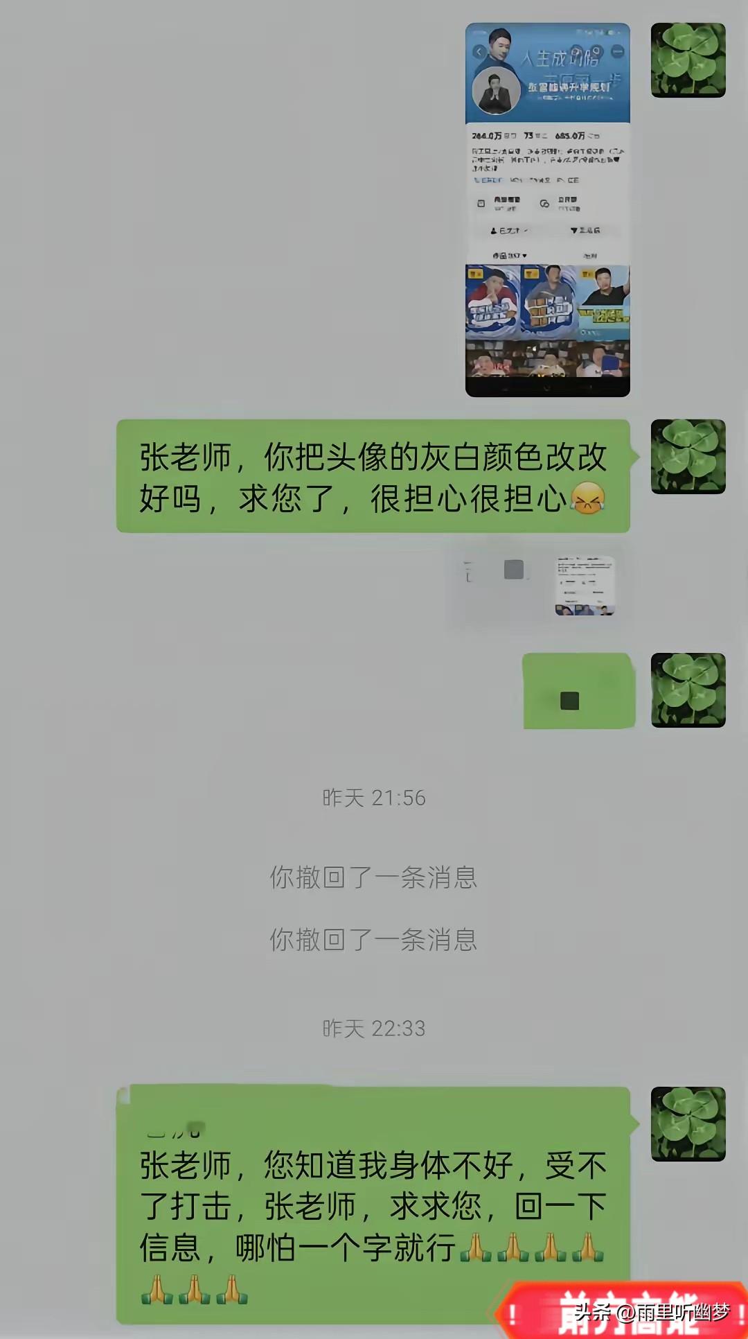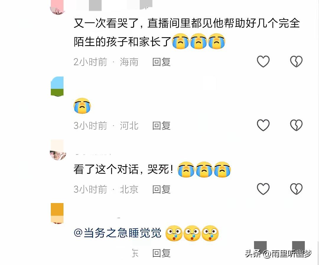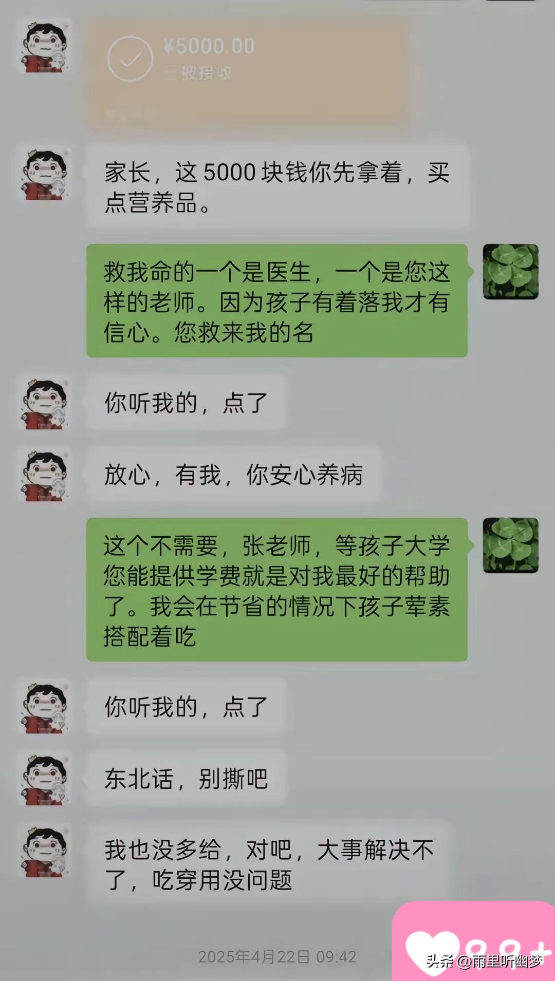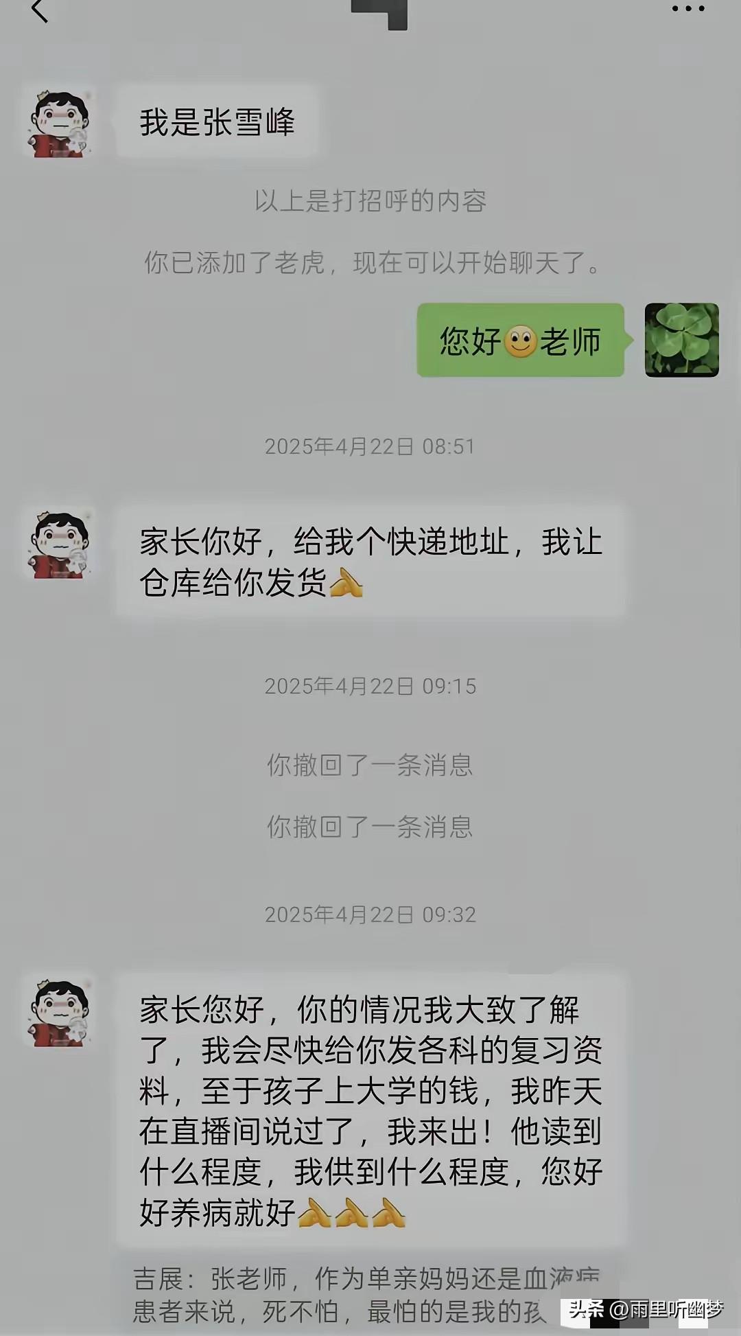 张雪峰又“出手”了,只是这次,没在直播间。 刷到几屏聊天记录,心里说不清是感动还是难过。 去年4月,一位单亲妈妈,也是血液病患者,在张雪峰直播间说了自己的难处。本以为只是千万条留言中的一条,没想到,张雪峰主动加了她微信。 开口第一句不是客套——“家长你好,给我个快递地址,我让仓库给你发货。” 接着,各科复习资料、生活费,甚至一句承诺:孩子上大学的钱,我来出,读到哪,供到哪。 对话里有一幕特别戳人—— 两人隔着屏幕互相推让,一个说“这钱你拿着”,一个说“真不需要”。 直到张雪峰用东北话回了一句:“别撕吧。” 这三个字,比什么漂亮话都实在。 更揪心的是,第二天晚上,这位妈妈发来消息:“张老师,您把头像是灰白颜色改改好吗,求您了,很担心。” 她身体不好,受不得刺激,却还在为对方一个头像颜色提心吊胆。 直到张雪峰回了信息,她才安心。 很多人说张雪峰说话直、嘴快。 但这几屏聊天,让人看到的,是一个刀子嘴豆腐心的人,把“说到做到”四个字,放在了最不起眼的对话框里。 有人问,什么是“别撕吧”的含金量? 大概就是——这世上有些人,帮你,从不让你觉得被施舍。