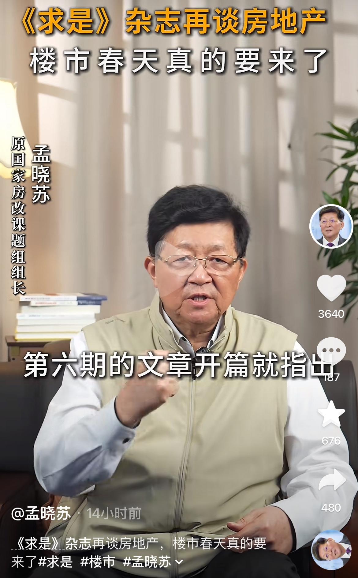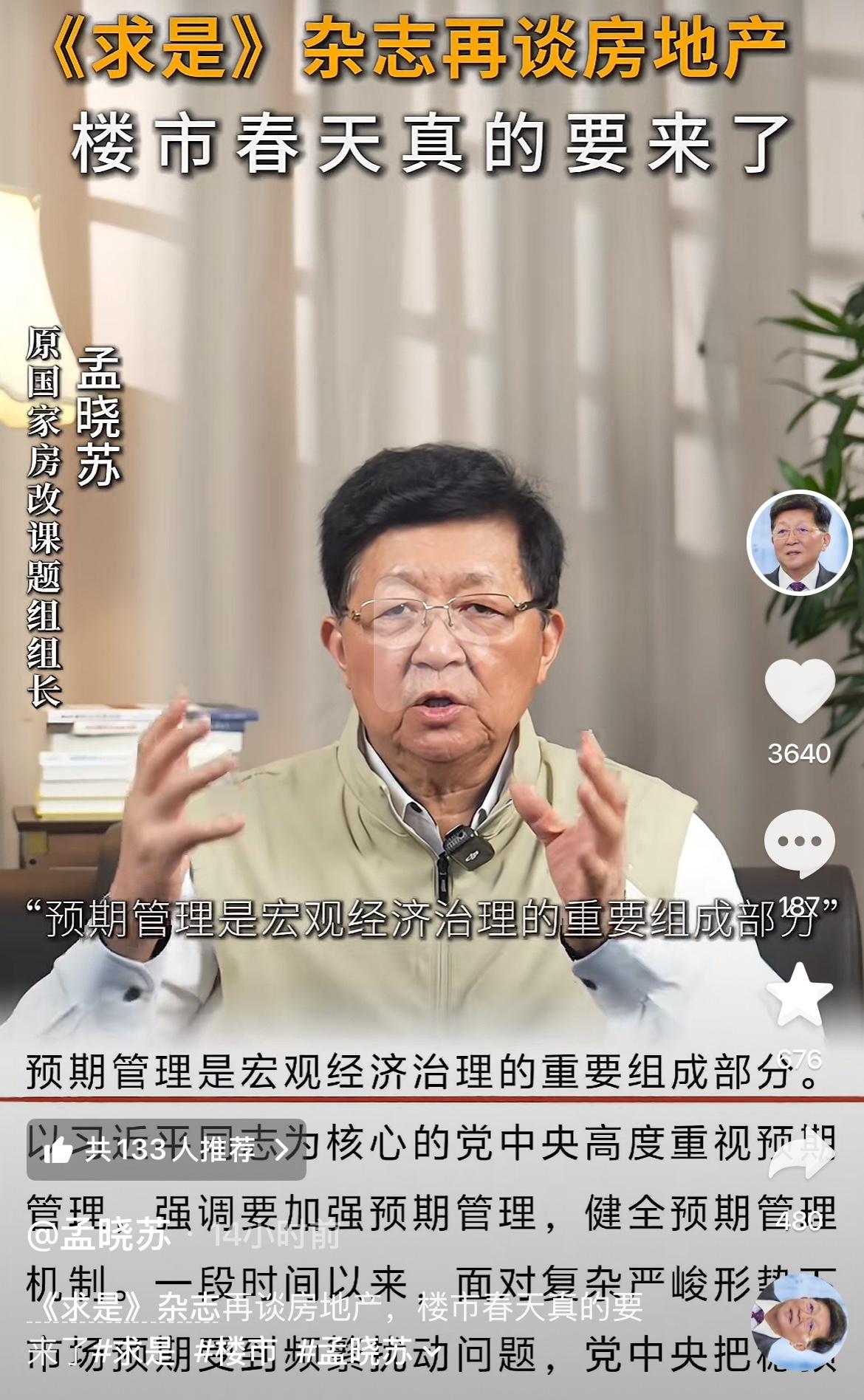 著名房地产专家孟晓苏:官方定调,房地产的春天就要来了!! 作为前中房集团董事长,房改组组长,孟总一直以来都看好房地产。 这次,他说,官方都发声了,房地产的春天到了为时不远。 孟总不愧是高层智囊,他被誉为中国房地产之父; 对推动中国房地产高速发展,做出了巨大的贡献。 香港当年房价大跌,也是孟总带队前往救市; 孟总跟团队经过详细科学的研究,只用了一招就救活了香港楼市。 这个大招非常简单,就一个字:涨!! 为何老百姓不买房,不投资,不消费? 就是因为房价下跌,他们财富缩水,没有信心了。 他们最害怕房价下跌影响他们的财富。 怎么才能让他们不担心房价下跌,就是涨起来 只要涨起来,老百姓就不担心房价下跌。 于是信心回来了,于是进场接盘,房价继续涨; 财富暴涨,有钱了,就敢消费,经济问题自然迎刃而解。 孟总一直非常看好房地产,他认为还有很大空间; 毕竟,还有几亿农民要进城发展,还有很多年轻人有改善需求。 难道他们进城打工,创业,不需要住房子吗? 因此,空间还很大!! 2026年,孟总发出终极预言,大概率要涨起来! 对于孟总的观点,你认同吗? 房地产的春天又要来了,你准备好钱包进场接盘了吗?
