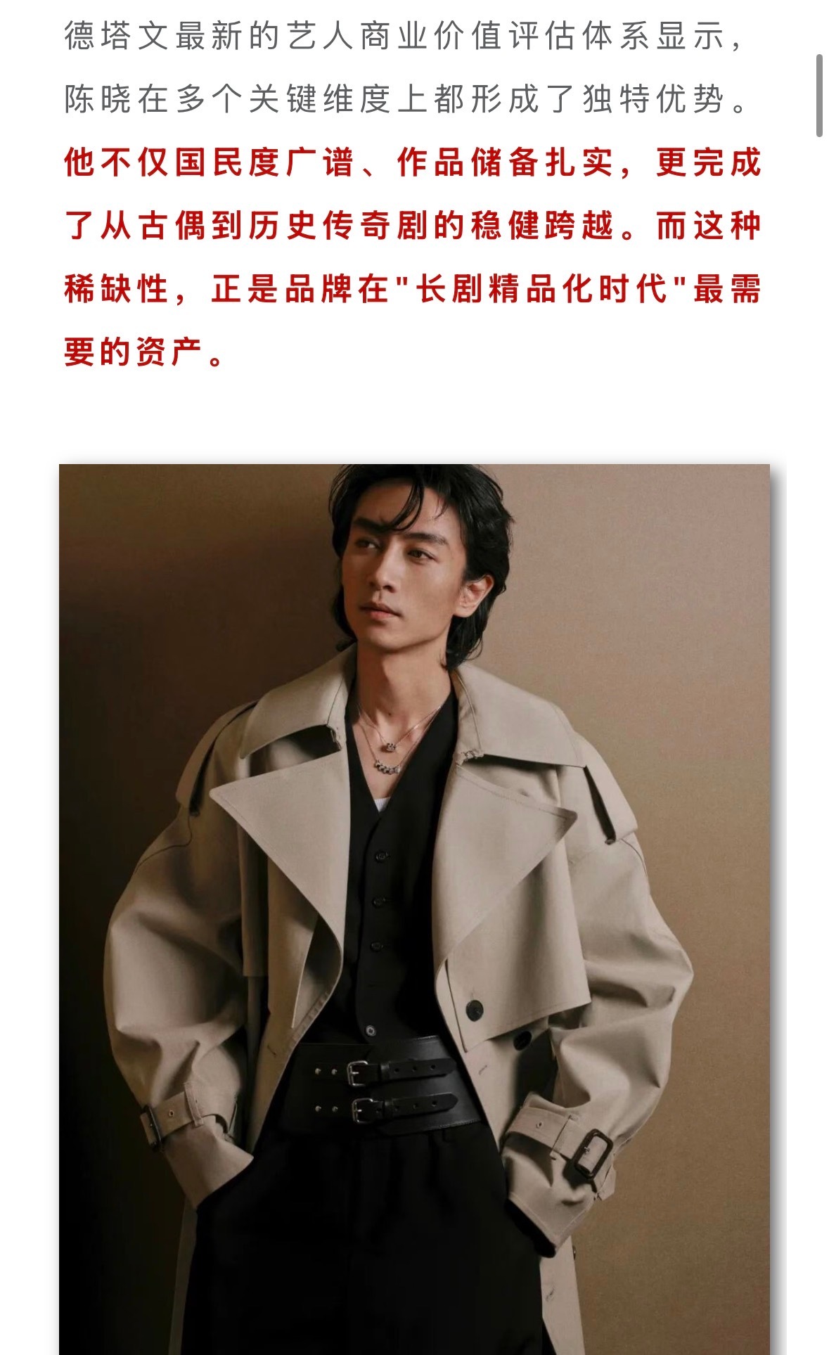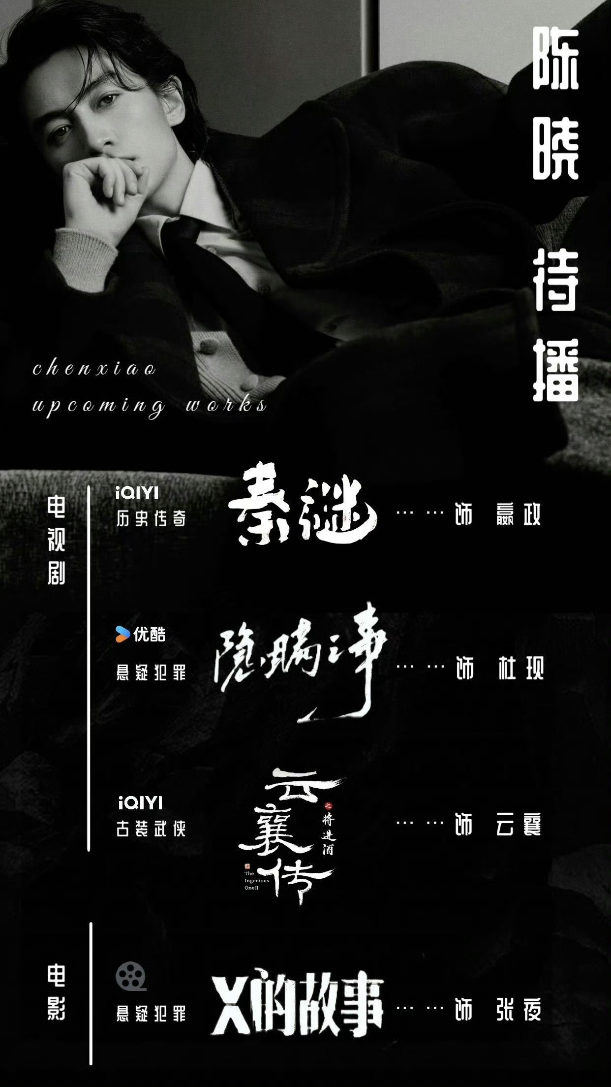 陈晓选本这块战绩可查陈晓的选本眼光真的内娱独一份!央八古装史冠《大生意人》、口碑齐爆的《人生之路》《尘封十三载》《云襄传》,年代、刑侦、武侠全能hold住,戏路宽到没边界。不恋综艺热度,一心沉在戏里,每个角色都鲜活有层次,扛剧能力实打实,永远可以放心追陈晓的剧!题材持续升级,角色次次突破,坐等陈晓带来更多荧幕惊喜!陈晓样样顶