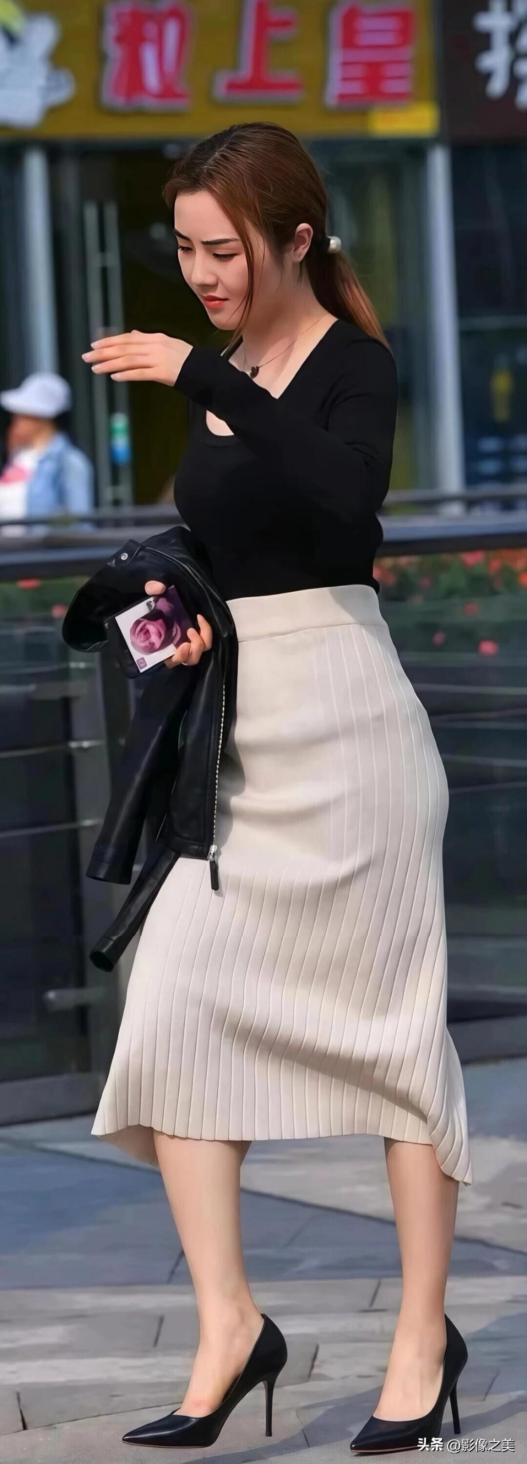街头偶遇的干练姐姐,黑色皮衣+米白竖纹半裙,踩上尖头高跟,又酷又温柔,走路都带风,太有气质了