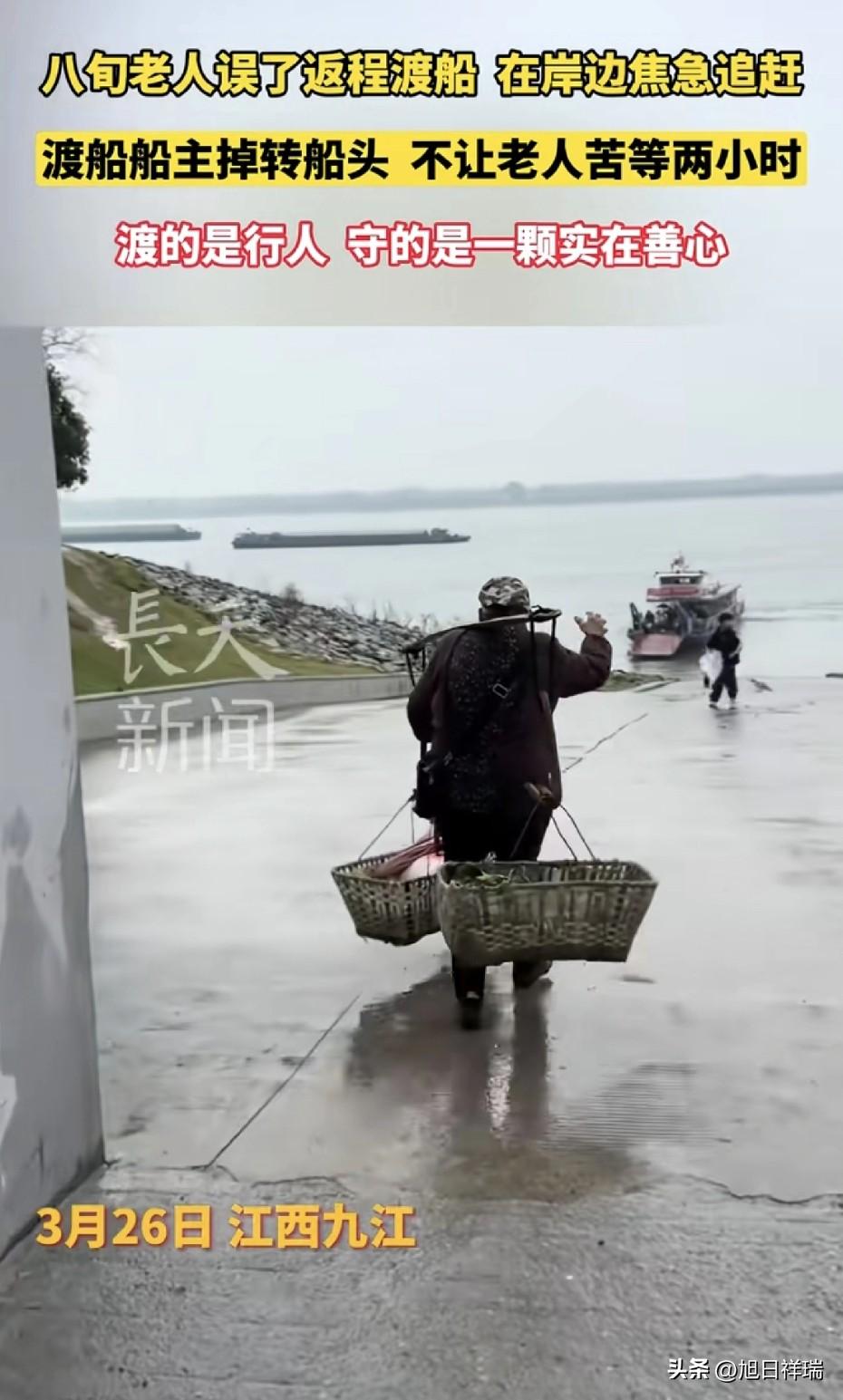 渡的是行人,守的是一颗实在善心!八旬老人误了返程渡船,在岸边焦急追赶。渡船船主动掉转船头。船主:谁家都有老人,哪能看着她干等两个小时。 江西彭泽套口轮渡码头,前两天发生了这么一幕。 一个卖菜的老太太,年纪看着有八十了,挑着担子紧赶慢赶,还是眼睁睁看着渡船开走了。 这趟船走了,下一趟得等俩小时。 老人家那个急啊,在岸边跟着船走的方向追,步子又碎又乱,担子在肩膀上直晃。 这时候船已经开出有一段距离了。 换做一般人,心里可能就算计:油钱多少、耽误的时间多少、一船乘客愿不愿意等? 算来算去,结论多半是“算了”,又不是我的责任。 但这个船主没算这笔账。 他看见岸上那个追船的身影,直接掉转船头,开了回去。 船靠岸后,船上的人也没闲着——一个船员挑起老人的菜担子,另一个伸手把老人稳稳当当地扶上了船。 整个过程没几句台词,就是那个掉头的动作,利落得让人心里一热。 有网友说,这船主掉个头,油费可能比老人那一担菜钱还贵。 账是这么算的,但人心不是这么算的。他心里那杆秤,称的是“一个老人大冷天在江边干等俩小时”这件事,他看不下去。 这才是最难得的——有些人看见别人为难,第一反应是“关我啥事”; 有些人看见别人为难,第一反应是“我得帮一把”。 这个船主和他的船员,就是后一种人。