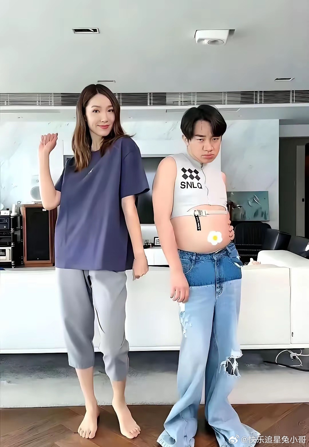 王祖蓝的裤子穿在他老婆身上秒变六分裤,夫妻俩换着穿,太搞笑了。