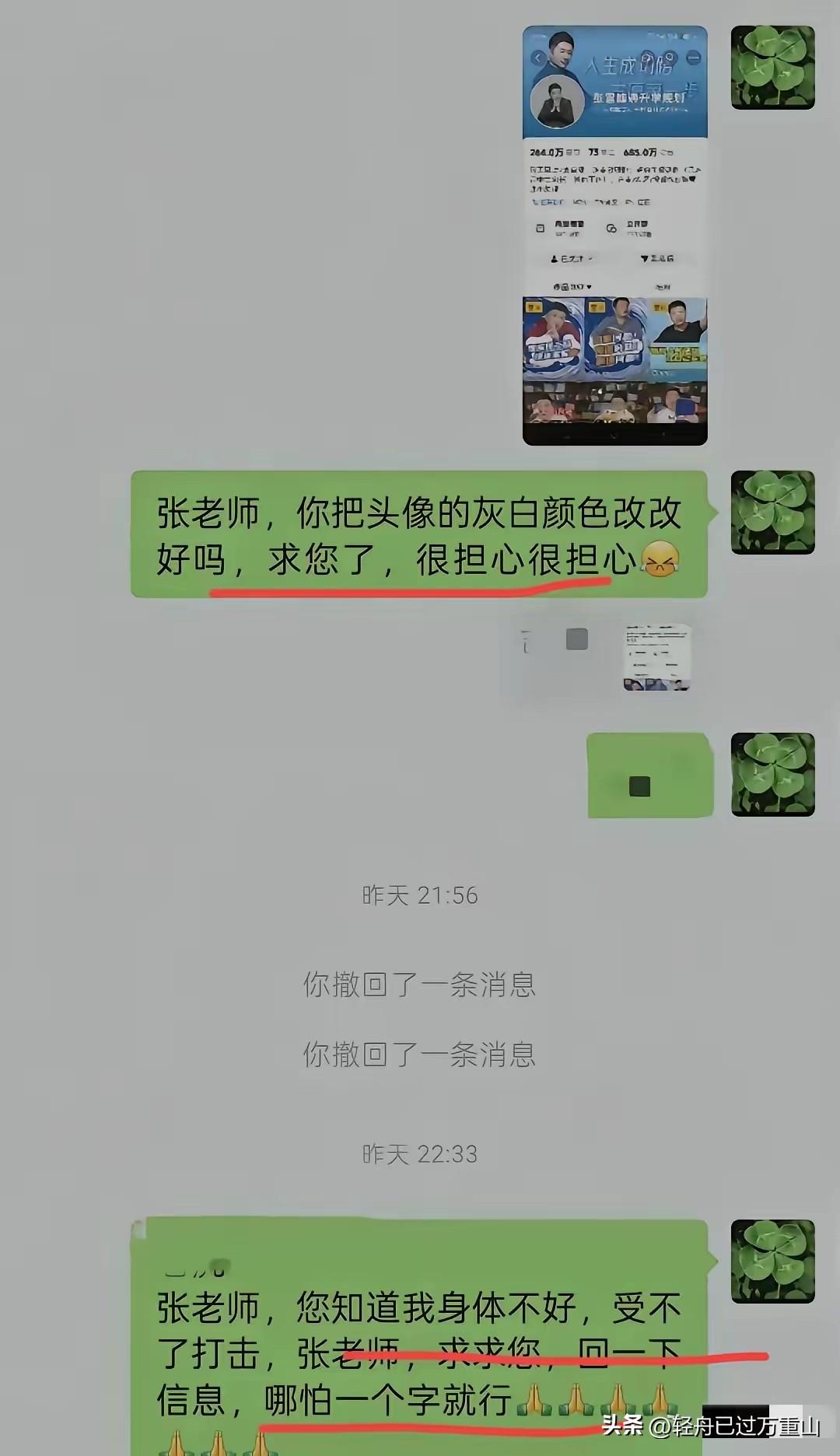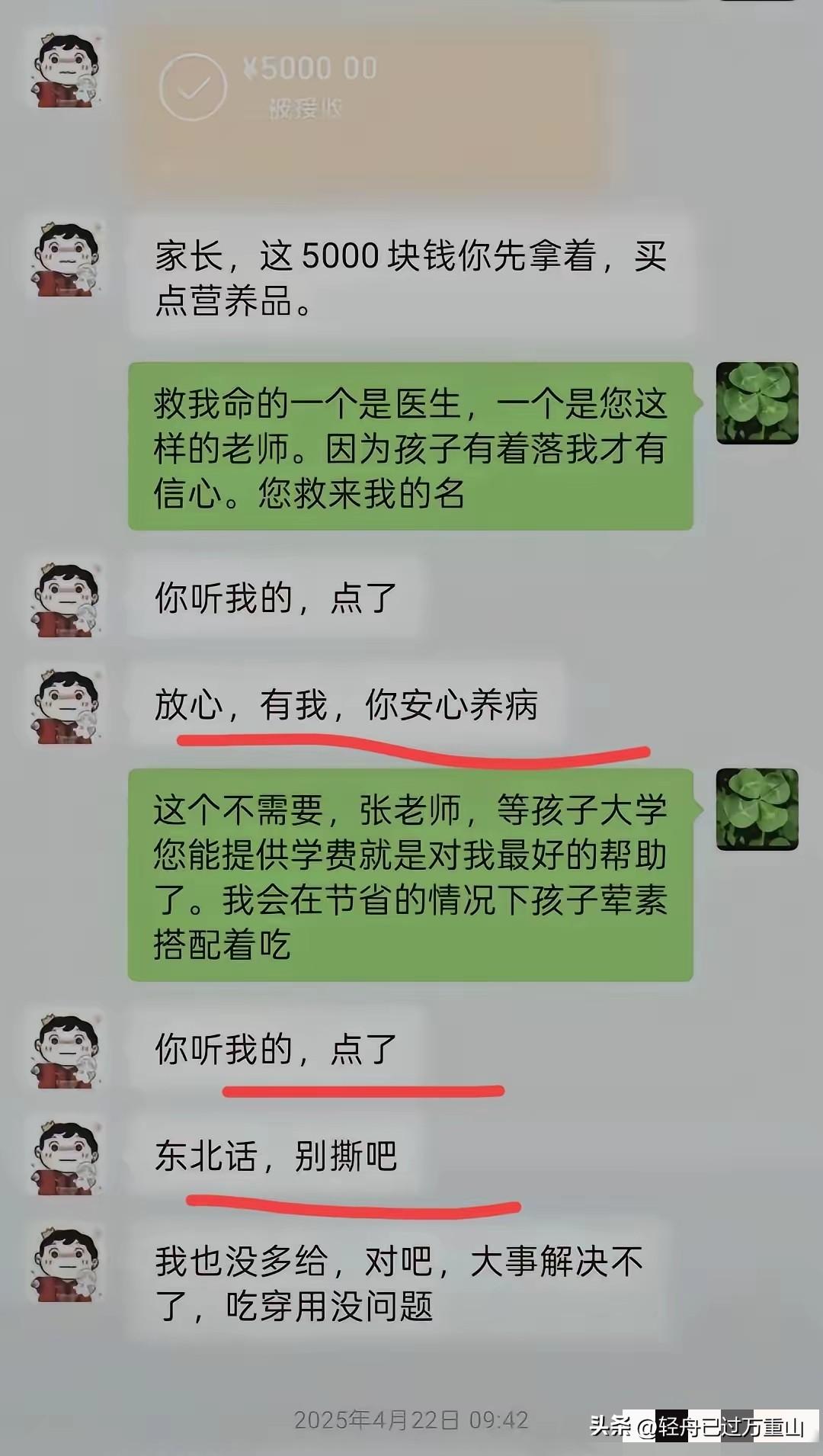泪目,今天是张雪峰的追悼会,看到这几张聊天截图,我总算懂了“寒门再无张雪峰”这句话的份量,这位妈妈是血液病患者,独自带着高二的孩子,孩子成绩从重点高中前200掉到了400名,没钱补课,她试着联系了张雪峰老师。 张雪峰这样的大忙人,竟然添加了家长的微信,并主动要求家长把地址告诉他,他安排快递给她的孩子免费发补习资料,听到这位家长有困难,他承诺会提供帮助,还在直播间说会供这孩子上大学,他不只是嘴上说说而已,而是实打实的真金白银帮助,他不但给孩子提供复习资料,甚至给孩子母亲发了5000元的红包,说买营养品的。 母亲虽然困难,但是不忍心接受他的5000元,看到这个倔强的母亲迟迟未领取他的红包,他还不断催促孩子母亲点了,还说“放心,有我,你安心养病。”孩子生病的母亲说不能要,他能帮助孩子提供大学的学费已经非常感激了,还说没关系虽然条件不好但是会尽力给孩子荤素搭配,张雪峰一句东北的“别撕吧,大事解决不了,吃穿用没问题”让人看完泪目。 这个温暖人心的人,才41岁就走了,这位母亲看到他的头像变灰泪目了,微信私聊说:“张老师,你把头像的灰白颜色改改好吗?求求你了,我很担心很担心 您知道我身体不好,受不了打击,张老师求求您了,回一下信息,哪怕一个字都行。” 就这样一个张雪峰,他就这样猝不及防就走了,他的这半辈子真的帮助了太多的人,你以为他只会直播赚那些普通家庭的血汗钱?他赚了钱除了养活二三百个员工,还建立了暖风助学金,专门帮助贫困家庭的孩子上学,他曾经也是寒门,通过自己的努力走入上层社会,他没有忘记那些和他一样需要帮助的人,所以他用实际行动来积德行善。 这些年,你看到的只是他一场直播可以赚很多钱,却没有看到他累计捐款超600万,年资助300名贫困生,推动升学规划更透明更普惠,让社会正视。寒门需要的不是鸡汤是活路,他走了,燃尽自己,照亮别人。 今天是张雪峰的追悼会,凌晨5点多,街上已经排起了自动送行的人们,大家排成了长龙,路两旁都站满了人,一个个不舍的张望,一束束艳丽的菊花,世上再无张雪峰,寒门再没领路人,先生大义,一路走好!