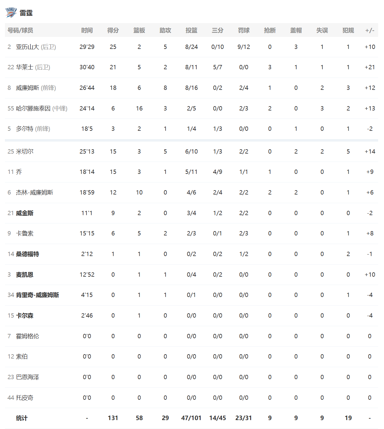 亚历山大24中8(三分10中0)致敬偶像,得到25分5助攻3盖帽!卡森华莱士11中8(三分7中5)砍下21分5篮板3抢断,杰伦威廉姆斯16中8拿到18+6+8,哈腾6+16+3,多尔特3+2!