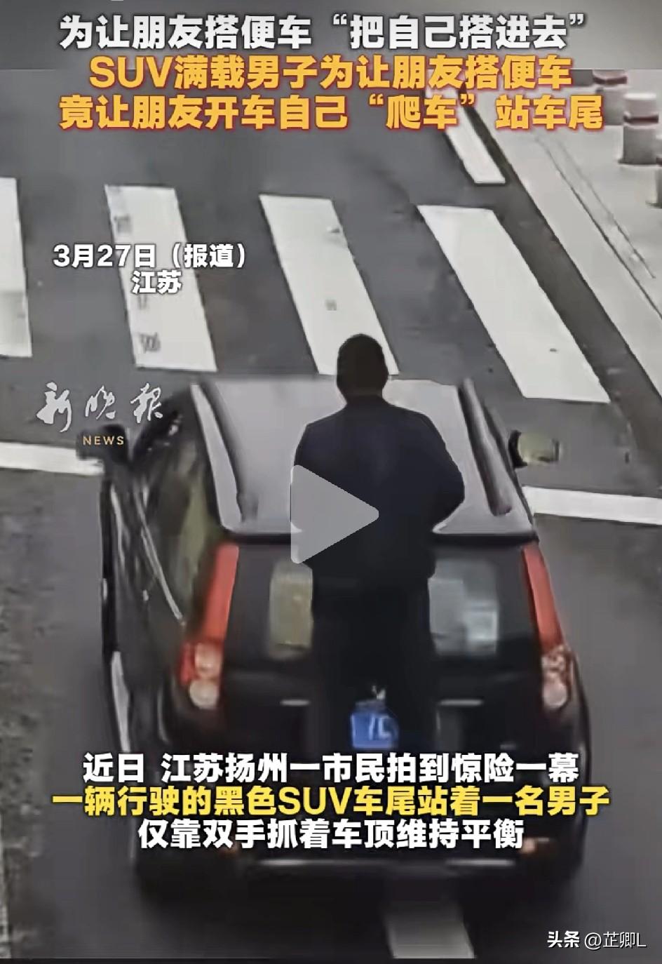 只有想不到,没有做不到!扬州一SUV车尾站人,全程抓车顶玩命,两人双双被罚! 江苏扬州惊现惊险一幕,简直就是在拿生命开玩笑! 有网友在路上拍到,一辆黑色SUV正常行驶,而车尾居然站着个大男人。 男人的两只手死死抓着车顶,脚下就踩着不到10厘米宽的小踏板,看着让人倒吸一口冷气! 好好的车里不坐,为啥偏偏要站在这么危险的车尾? 原来车主牛某是做水果生意的,当天车里装满了菠萝,压根没多余座位。 但是,刚好有朋友想要搭车,牛某就心生一计,让朋友开车,自己直接跑到车尾站着。 就为了省点事,也不用拒绝朋友的请求,完全不管安不安全。 这可真是只有想不到,没有做不到啊! 不过呢,这波危险操作直接被民警盯上,最终处罚结果来了:车主牛某罚款200元,驾驶证记6分;开车的朋友也没跑掉,罚款50元,记3分。 真是得不偿失! 开车上路啥都能省,唯独安全是断断不能省。这种玩命行为可千万别学,一旦出事后悔都来不及! 素材来源:新晚报,侵联删!