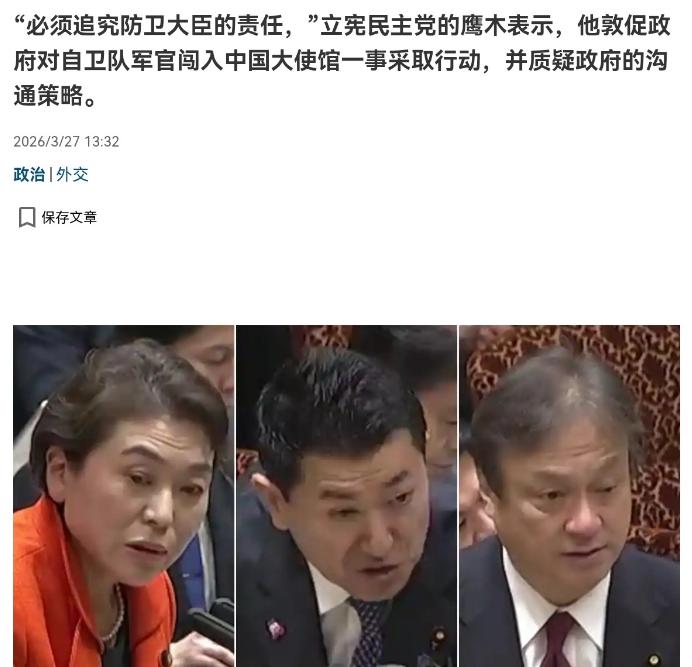 在日本政坛发出一声怒吼!要追究小泉进次郎责任!3月27日,日本立宪民主党议员高木真理就自卫队军官闯入中国驻东京大使馆事件质询称,他对政府延迟发布信息表示关切,防卫大臣小泉进次郎应该为此事负责,日方反应迟缓。我想了解一下信息控制问题,以及日本方面迟迟没有做出回应的情况。 说白了,日本政府在自卫队军官闯中国驻日使馆事件上的信息控制与回应迟缓,表面是流程拖沓、信息核实慢,实则是岸田政府刻意回避责任、切割风险、维护日美同盟优先的政治算计,更是防卫省系统性管理失序的集中暴露。 要知道,3月24日上午,日本陆上自卫队三等陆尉村田晃大携带18厘米刀具翻墙闯入中国驻东京大使馆,威胁杀害外交人员,中方当天就严正交涉、强烈抗议。可日方反应慢得离谱:中方通报后9小时警方才正式抓人,防卫省、内阁官房长官直到25日才含糊表态“深表遗憾”,作为主管大臣的小泉进次郎更是全程沉默,直到3月27日才在国会质询压力下开口,全程没有一句正式道歉,还试图把事件定性为“个人行为”切割责任。中方要求彻查、严惩、给交代,日方却用“核实情况”“严肃处理”等空话敷衍,这种操作活像揣着明白装糊涂,只想大事化小、小事化了。 并且,事件发生后,日方第一时间不是公开事实、回应关切,而是内部捂消息、统一口径:防卫省迟迟不披露涉事军官背景、离岗细节,内阁官房长官只提“加强警戒”不提追责,小泉进次郎更是“失声”三天,连基本的外交表态都没有。他们刻意模糊事件性质,淡化自卫队管理失职,只强调“个人行为”,本质是怕担责、怕得罪国内右翼、怕影响日美同盟,所以用信息延迟、模糊表述来规避政治风险,把外交危机变成内部“维稳”。 而日本政府长期奉行“信息管控优先”,这种操作也早有先例。从驻日美军基地污染水泄漏迟报4年,到各类安全事故“先捂后报”,再到《特定秘密保护法》赋予政府宽泛的信息保密权,日本官僚体系早已形成“多一事不如少一事”的惯性——对敏感外交事件,先内部消化、再选择性公开,能不道歉就不道歉,能不追责就不追责。这次闯馆事件,防卫省作为主管部门,对现役军官离岗、携刀闯馆毫无预警,本身就是严重管理失职,却用“核实情况”拖延,本质是用信息控制掩盖系统性失序。 说实话,日方回应迟缓,核心是怕得罪美国、怕破坏对华强硬的政治人设。岸田政府一直紧跟美国对华遏制,国内右翼势力不断煽动反华情绪,若此时公开承认自卫队管理漏洞、向中方正式道歉,既会被右翼骂“对华软弱”,又可能影响日美同盟步调。所以政府选择“冷处理”:用时间淡化事件热度,用模糊表述降低外交烈度,用“个人行为”切割政府责任,既不得罪美国,也不向中方低头,本质是把外交责任当成国内政治博弈的筹码。 更关键的是,小泉进次郎的沉默与迟滞,是防卫省官僚主义与政治投机的集中体现。作为防卫大臣,他对自卫队纪律涣散、人员管理失控负有不可推卸的责任,却在事件发酵三天后才表态,还只说“深感遗憾”、不提道歉与追责。这不是个人风格,而是防卫省长期“重对外姿态、轻内部管理”的必然结果——平时忙着配合政府对华强硬,对自卫队内部纪律、人员心理、离岗管控视而不见,出了事就想甩锅、捂消息,用信息控制逃避问责。 要清楚,日本政府这种“信息捂盖、责任切割”的操作,在外交史上早有教训。当年日本在历史问题、慰安妇问题上长期隐瞒信息、回避责任,最终导致外交信誉崩塌、地区关系紧张。历史总是相似,外交事件中,信息透明、责任担当才是破局关键,刻意捂消息、迟回应,只会让矛盾升级、信任流失,毕竟没有哪个国家会接受“捂盖子”式的外交敷衍。 而未来,日本政府大概率会继续“和稀泥”:一边对中方口头承诺“严肃处理”,一边内部淡化追责、不做正式道歉,同时继续管控信息、避免事件发酵。小泉进次郎虽被在野党追责,但岸田政府大概率会保他,用“个人行为”“纪律整顿”等说辞蒙混过关。关键转折点就看中方是否持续施压、国际社会是否持续关注,可照日本政府一贯的投机作风,大概率不会拿出真正的诚意,只会继续用信息控制和模糊表态,把外交危机拖成“不了了之”。 说到底,日本政府的信息控制与回应迟缓,本质是政治投机大于外交责任、国内博弈大于国际信义。所谓“核实情况”“流程缓慢”,不过是掩盖管理失职、回避外交责任的借口。日本看似用信息控制稳住了国内政治,实则彻底暴露了其外交的虚伪与短视,这种不负责任的操作,只会让中日关系更趋紧张,也让国际社会看清其霸权思维下的自私本质。 以上是小编个人看法,如果您也认同,麻烦点赞支持!有更好的见解也欢迎在评论区留言,方便大家一同探讨。