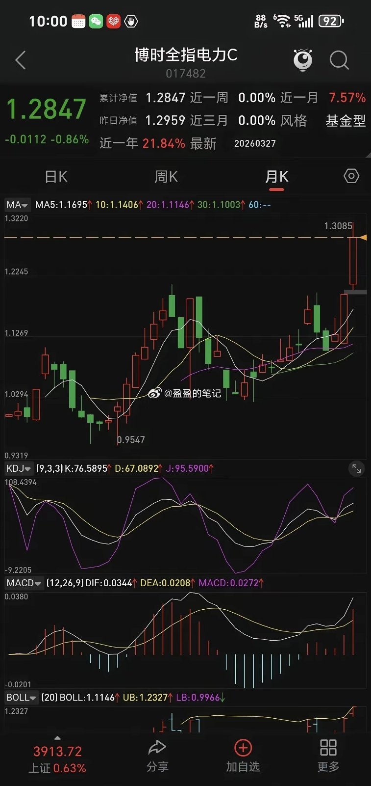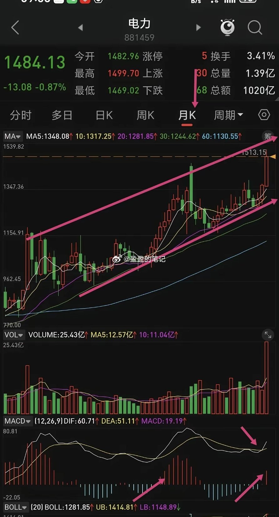 电力板块下周再不拉升我就出来,高位进去的,小绿一点点,不再熬下去了,感觉它上涨乏力,有点想退潮。周五电力指数收盘站上了5日线,还属于上涨趋势。从月线走势来看,趋势向上运行,还有上涨空间,等待时间有点长了,守一两个月不知道能涨多少,仓位不大,小赚小亏都不想拿它了。从过往经验来看,每年夏季来临前电力都有上涨,今年启动早点,属于慢牛行情,有点磨人。守坚持几个月肯定有盈利,不如弹性大的板块效果好。不是不看好,而且嫌它涨的慢,弹性小。喜欢它的可以继续持有待涨。