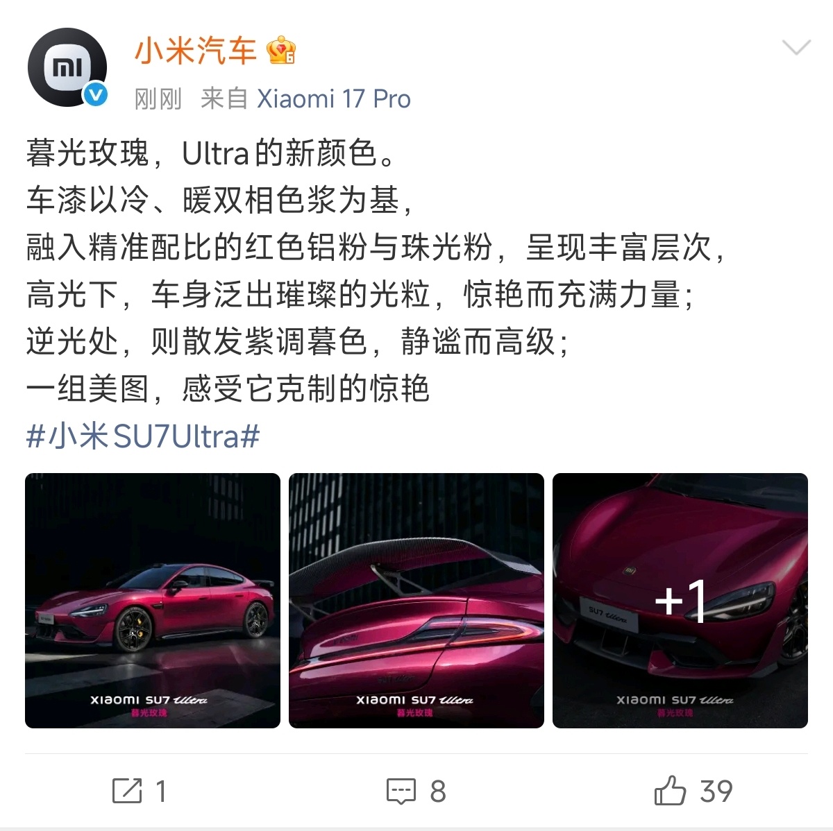今天,小米SU7Ultra新增暮光玫瑰车漆 小米高级定制服务当中的“暮光玫红”车漆现在正式上架到普通版选配当中了,价格依旧是1万1,相比于之前高定服务10万起的选配门槛,现在直接就能选,非常利好消费者了,而且也算是弥补了Ultra没有红色系车漆的遗憾。