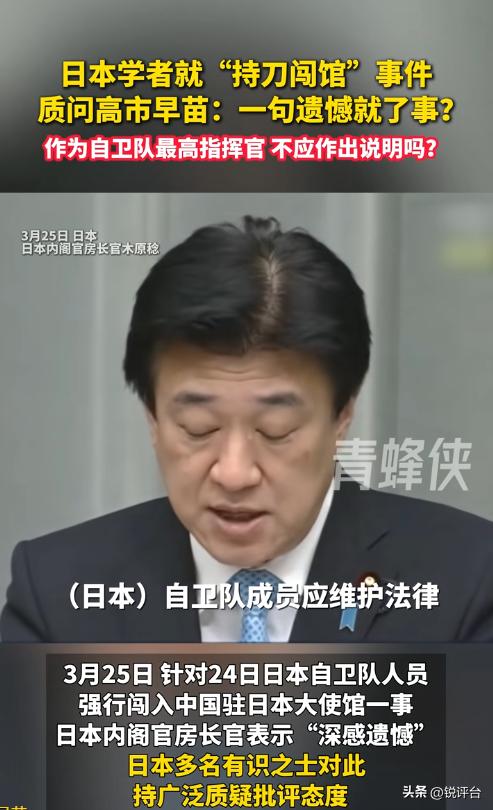 😤 诡异沉默!日本自卫官持刀闯我使馆,高市早苗为何全程装聋作哑? 日本现役自卫官持刀强闯中国驻日使馆,性质极度恶劣!举国哗然之际,首相高市早苗却离奇沉默,她到底在隐瞒什么?🤫 3月24日,23岁日本陆上自卫队三等陆尉村田晃大,携带18厘米长刀,翻墙闯入中国驻日使馆,扬言杀害中方外交官。事发后,日方仅轻描淡写"深感遗憾",高市早苗作为首相,始终未发一言、未表歉意,内阁集体噤声。 身为国家首脑,对如此严重的外交挑衅事件保持沉默,绝非疏忽!这是对国际法的漠视,更是对华敌意的纵容,其右翼本质暴露无遗。沉默等同于默许,无疑会助长日本国内极端势力的嚣张气焰。 更讽刺的是,就在闯馆事件后,高市早苗政府竟火速酝酿**降级对华关系**,试图转移焦点、倒打一耙,把挑衅者扮成受害者,玩起贼喊捉贼的把戏。 高市早苗的沉默与反转,大家觉得是心虚还是刻意挑衅?🤔 高市早苗沉默 日本自卫官闯中国使馆 中日关系